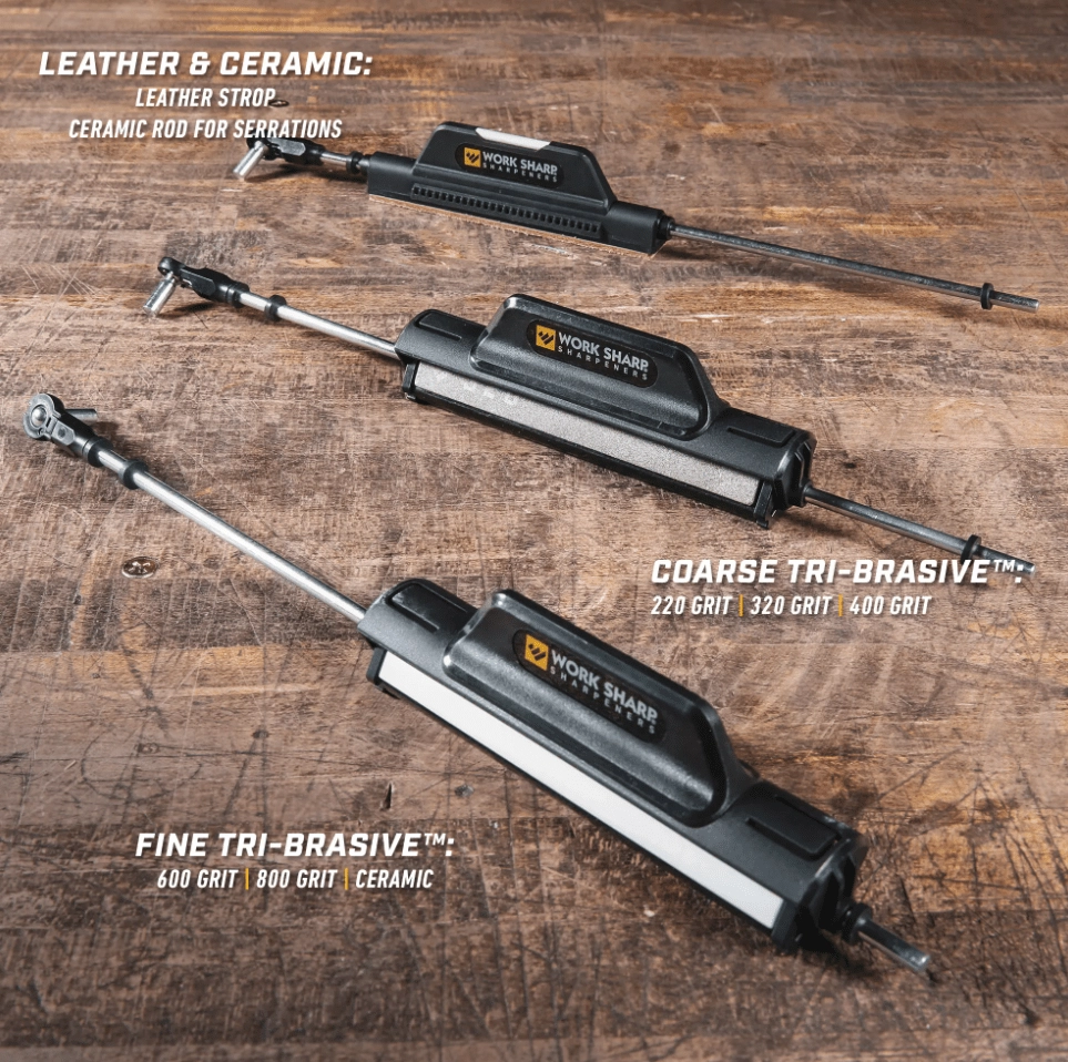 Les deux poignées ergonomiques Tri-Brasive® offrent une large gamme d’abrasifs pour toutes les étapes d’entretien du fil : des réparations et enlèvements rapides de matière, au réaffûtage précis, jusqu’au polissage final. L’ensemble comprend des plaques diamantées grains 220, 320, 400, 600 et 800, une plaque céramique fine et un cuir d’affilage pour une finition miroir. Pour les couteaux dentelés, la tige céramique permet de restaurer facilement le tranchant de chaque dent.