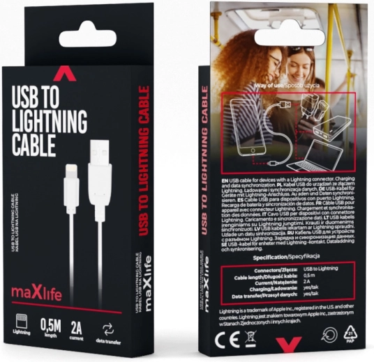 Le câble pratique Maxlife USB–Lightning est un excellent choix pour la charge quotidienne et la synchronisation des données. Grâce à un courant allant jusqu’à 2 A, il prend en charge une charge rapide et stable des modèles iOS plus récents. Sa longueur de 0,5 m réduit l’encombrement sur le bureau et est idéale pour la voiture, le bureau et les déplacements.