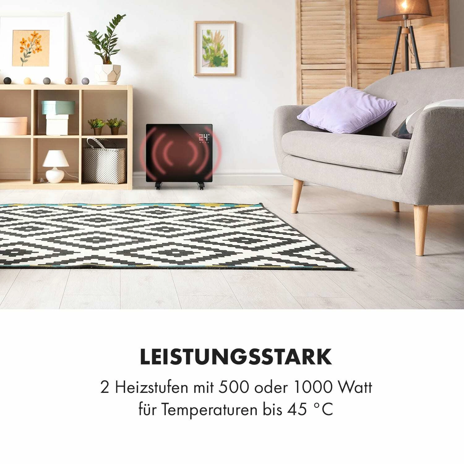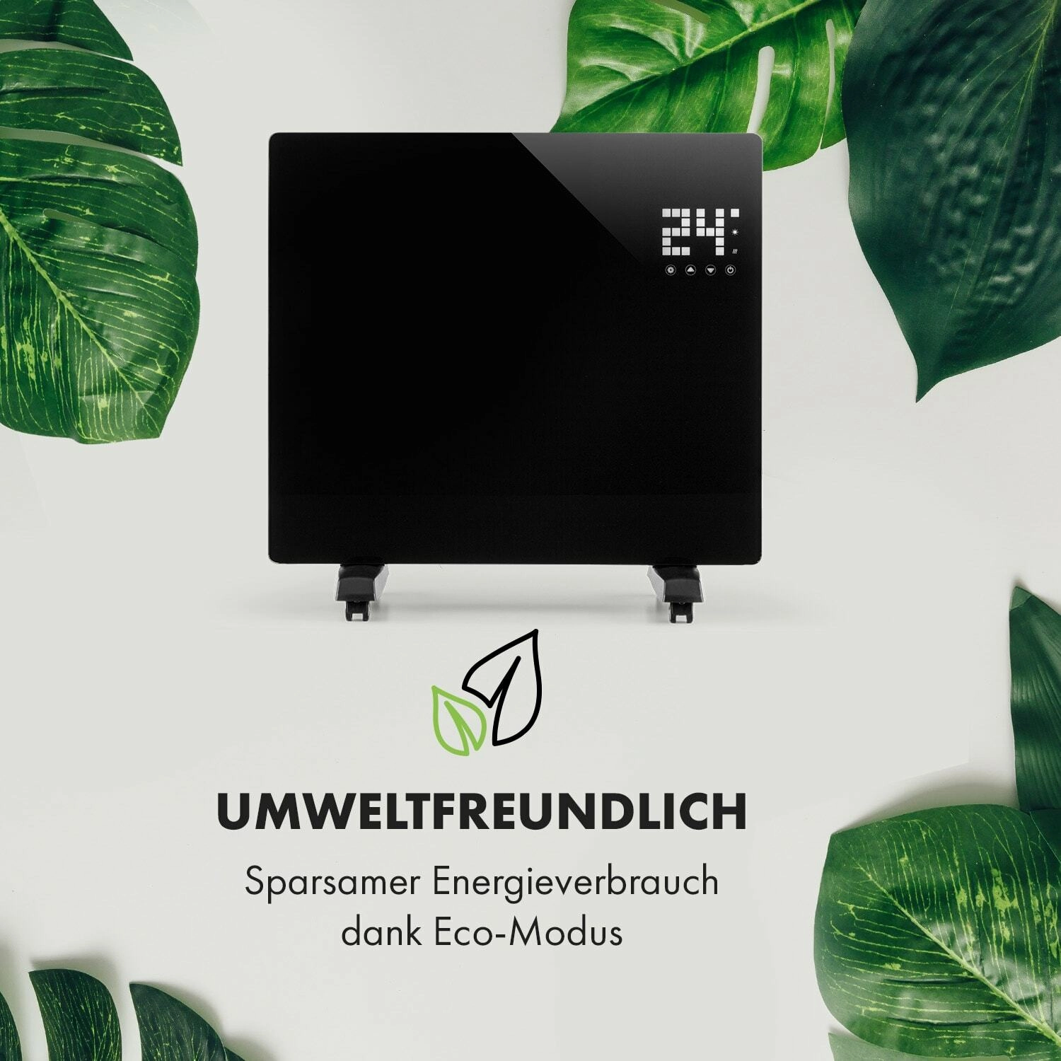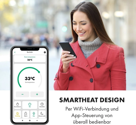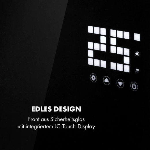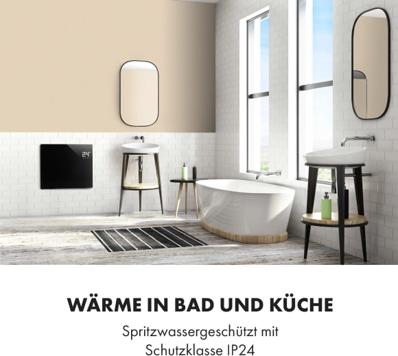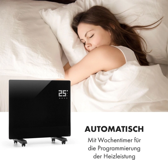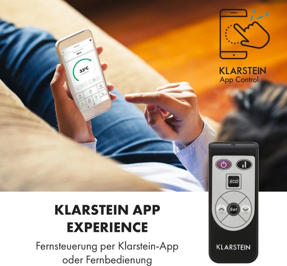 Des fonctions intelligentes pour plus de confort : via le Wi‑Fi et l’application Klarstein App, réglez tout à distance, ou utilisez le panneau LED tactile ou la télécommande. Le programmateur hebdomadaire permet de planifier le chauffage pour chaque jour. Le panneau en verre avec indice de protection IP24 résiste aux éclaboussures, idéal également pour la salle de bain.