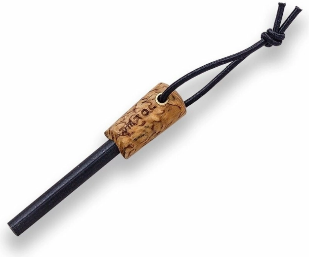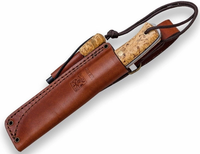La poignée en bouleau madré tient parfaitement en main, est agréable au toucher et dispose d’un passage pour cordon. Sont inclus un étui en cuir pour un port sécurisé et une pierre à feu, idéale pour allumer un feu par tous les temps.