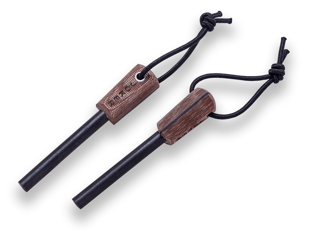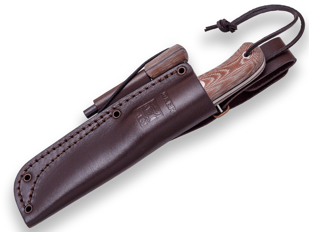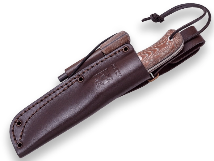 Le manche en matériau composite Micarta de couleur marron offre une prise sûre même humide et est complété par un trou pour dragonne. Sur le terrain, vous apprécierez le étui en cuir de qualité pour un port sécurisé et l’allume‑feu intégré pour faciliter l’allumage du feu.