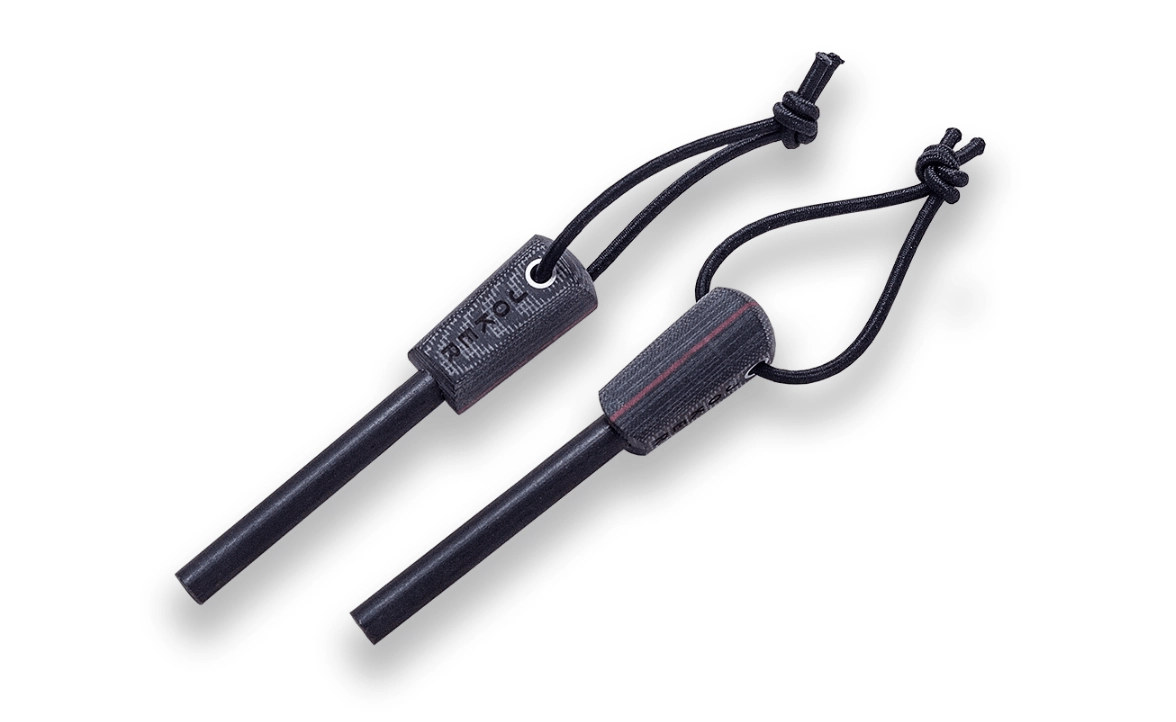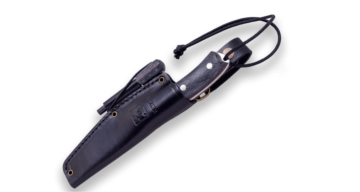 La poignée en Micarta noire avec accents rouges tient parfaitement en main même par temps humide. Le couteau est complété par un étui en cuir pour un port sécurisé, un allume-feu pour allumer un feu et une paracorde (2 m) pour les situations d’urgence en pleine nature.
