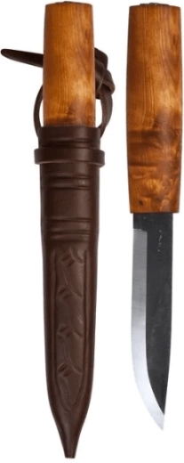 La lame fixe en acier inoxydable laminé à triple structure avec une émouture scandinave traditionnelle assure une excellente tenue de coupe, un affûtage aisé et des coupes nettes dans le bois comme dans les aliments. Le manche en forme de barillet en bouleau madré est effilé pour une prise en main confortable et sûre, tient naturellement en main et offre un contrôle excellent sans garde.
