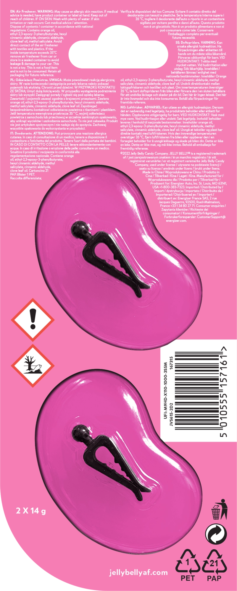 Offrez-vous le parfum ludique du chewing-gum avec le Jelly Belly Vent Clip-On. Il suffit de le fixer à la grille d’aération de la voiture, à la maison ou au bureau et de profiter d’un parfum intense jusqu’à 30 jours. Le pack DUO contient deux clips en forme de dragée pour une diffusion encore plus marquée.