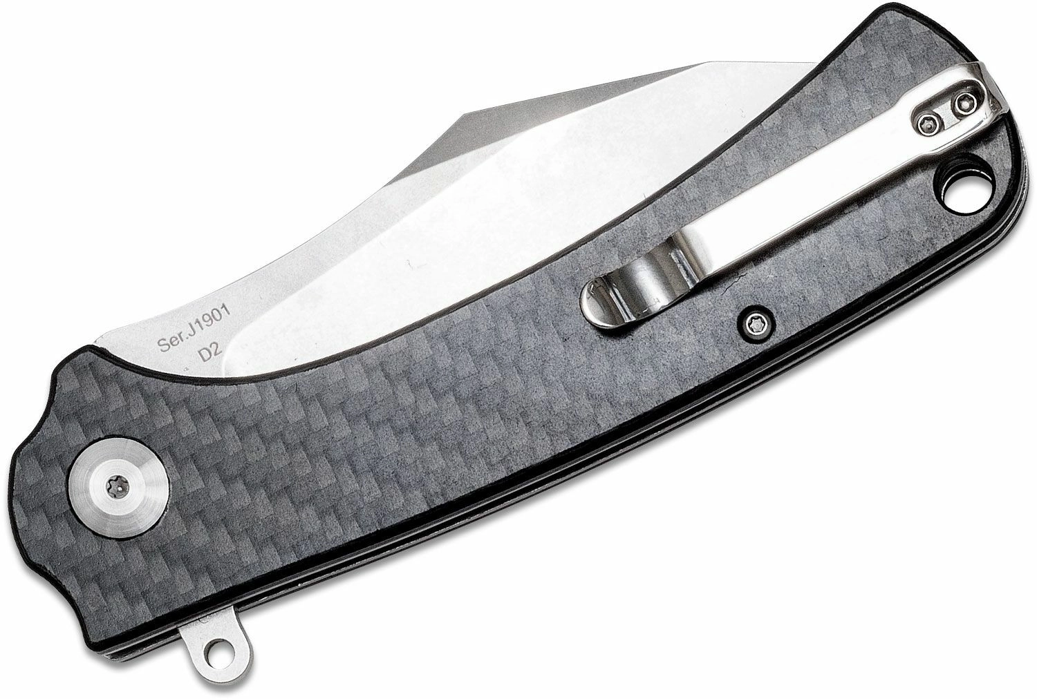 L’ouverture est rapide et fluide grâce au flipper, et la sécurité au travail est garantie par le verrou linerlock. La poignée ergonomique en fibre de carbone, en finition grise, tient parfaitement en main, tandis que le clip de poche et le trou pour cordon facilitent le port au quotidien.