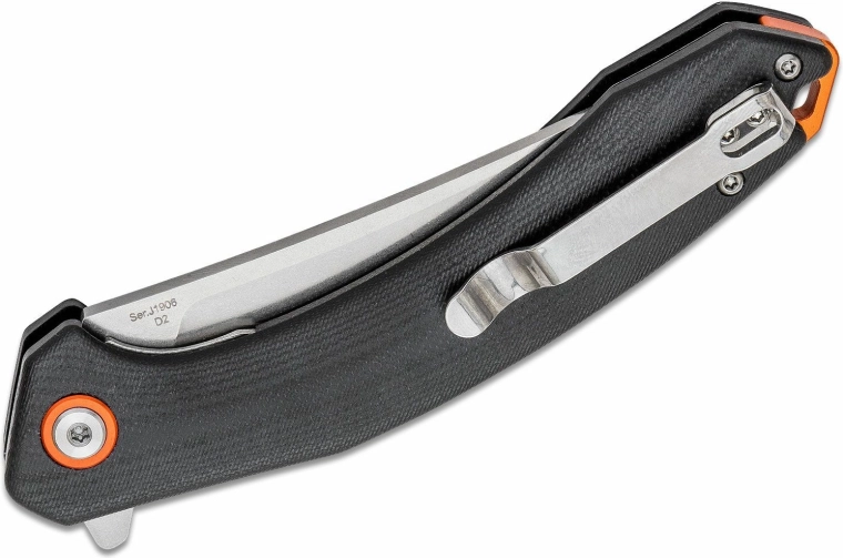 L’ouverture par flipper est rapide et fluide, tandis que le verrou linerlock maintient la lame en sécurité pendant l’utilisation. La poignée ergonomique en G10, usinée CNC, offre une tenue sûre même mouillée. Le clip de poche pratique et l’œillet pour lanyard facilitent le port et la sécurisation du couteau.