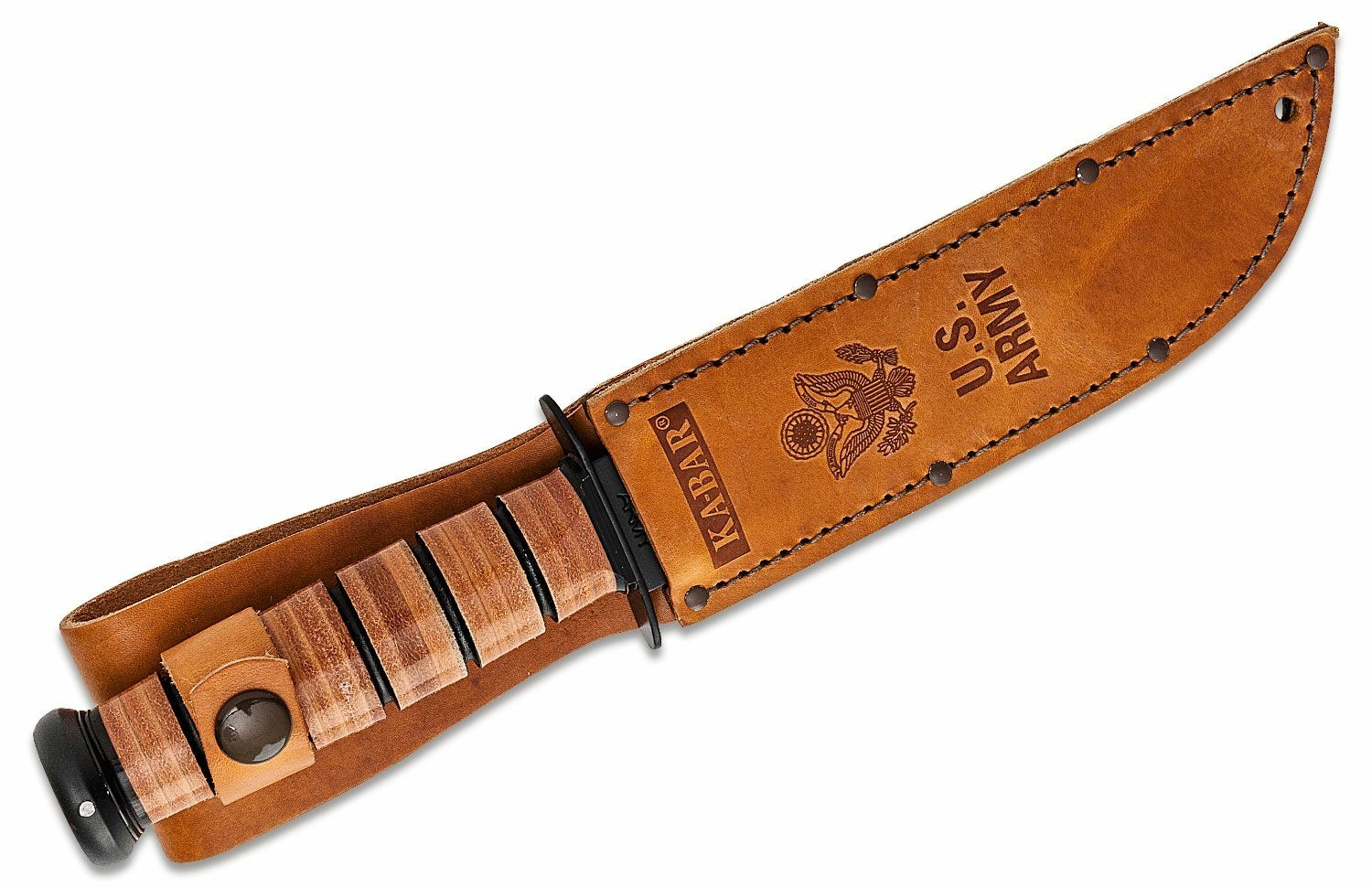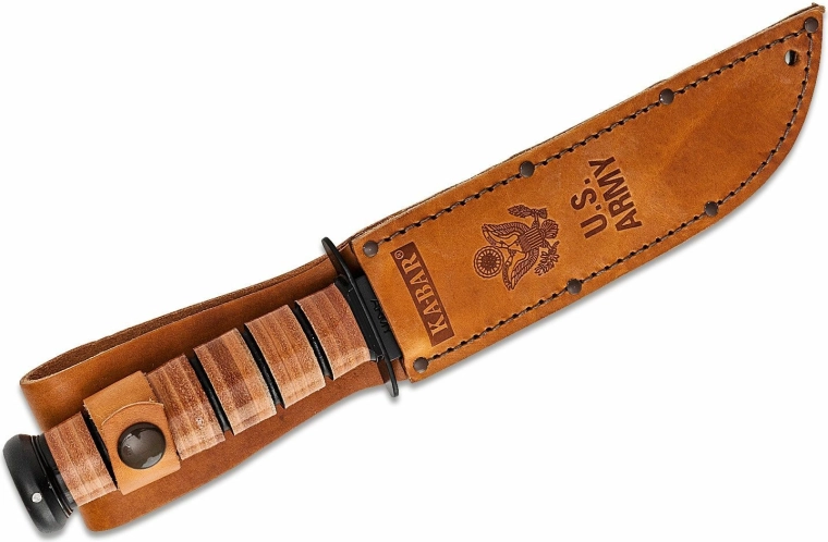 La poignée est fabriquée à partir d’anneaux de cuir pressés et polis, assurant une prise en main sûre et un look intemporel. L’emballage comprend un étui en cuir de qualité avec symbole et inscription U.S. ARMY, permettant un rangement sécurisé ou une mise en valeur dans une collection.
