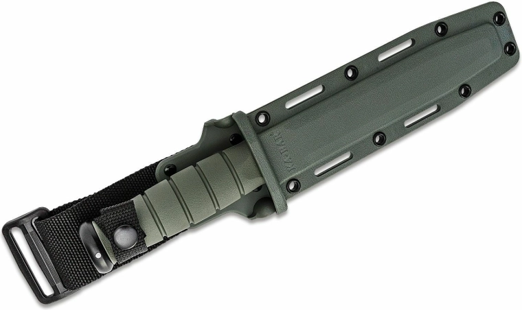 Couteau tactique robuste KA-BAR pour une utilisation exigeante sur le terrain et les activités de plein air. Il offre une lame fixe en 1095 Cro-Van avec un revêtement noir anticorrosion, une poignée antidérapante en Kraton de couleur verte et un étui en plastique pour un port sécurisé.
