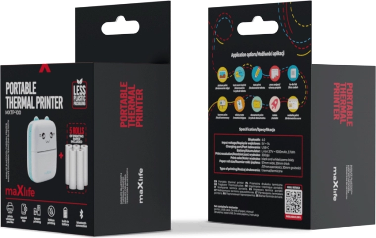 Profitez de la liberté d’imprimer à tout moment et en tout lieu. L’imprimante portable Maxlife MXTP-100 Blue fonctionne avec une technologie thermique, elle n’a donc pas besoin d’encre ni de toner. Il suffit d’insérer le papier thermique et de laisser libre cours à votre créativité : des notes rapides, autocollants et étiquettes jusqu’aux photos et dessins simples en noir et blanc.