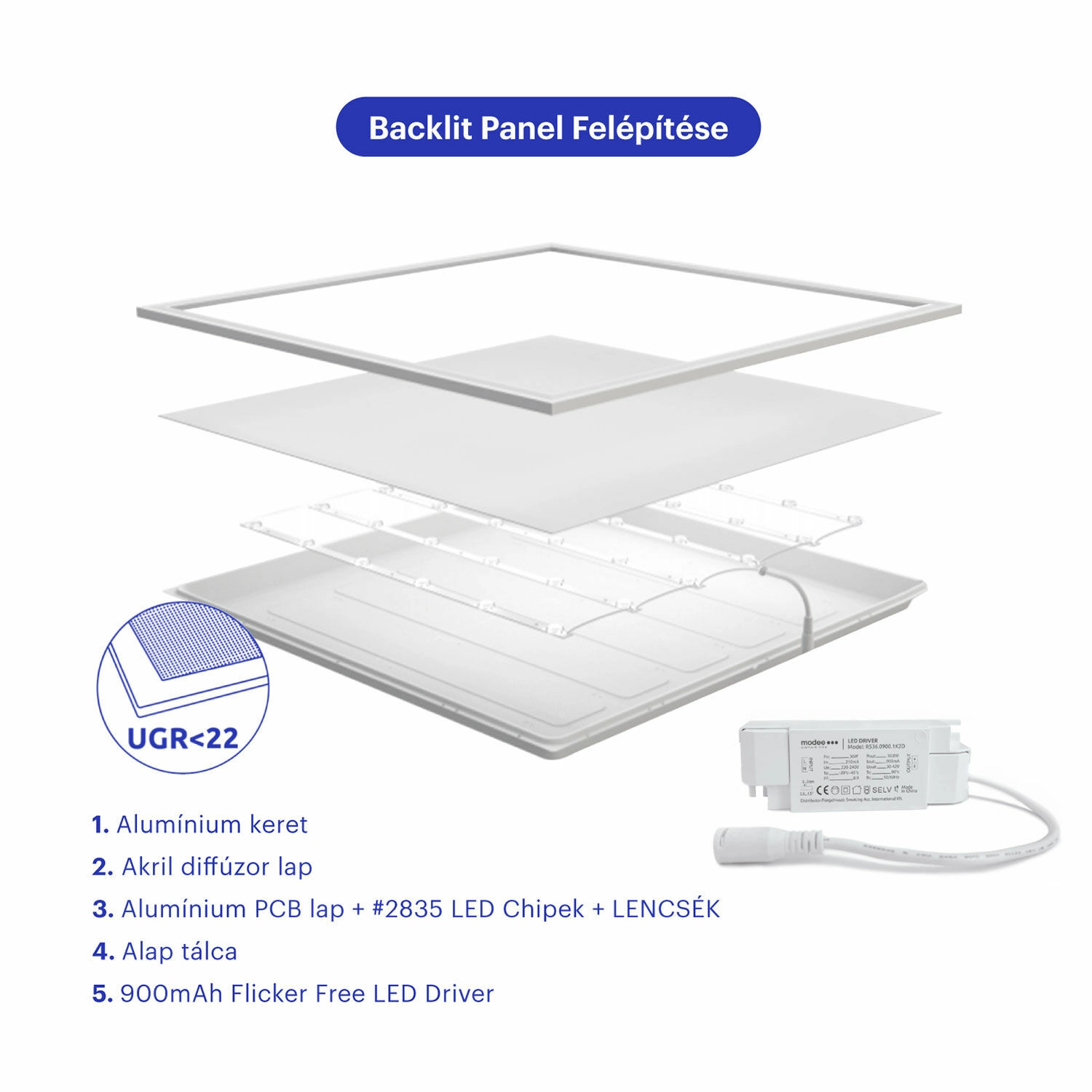 Panneau LED plafond professionnel MODEE BackLit de 60 × 60 cm offrant un éclairage uniforme et non éblouissant UGR<22, une haute efficacité 120 lm/W et une longue durée de vie jusqu’à 50 000 h – idéal pour les bureaux, écoles, hôtels et salles de réunion.