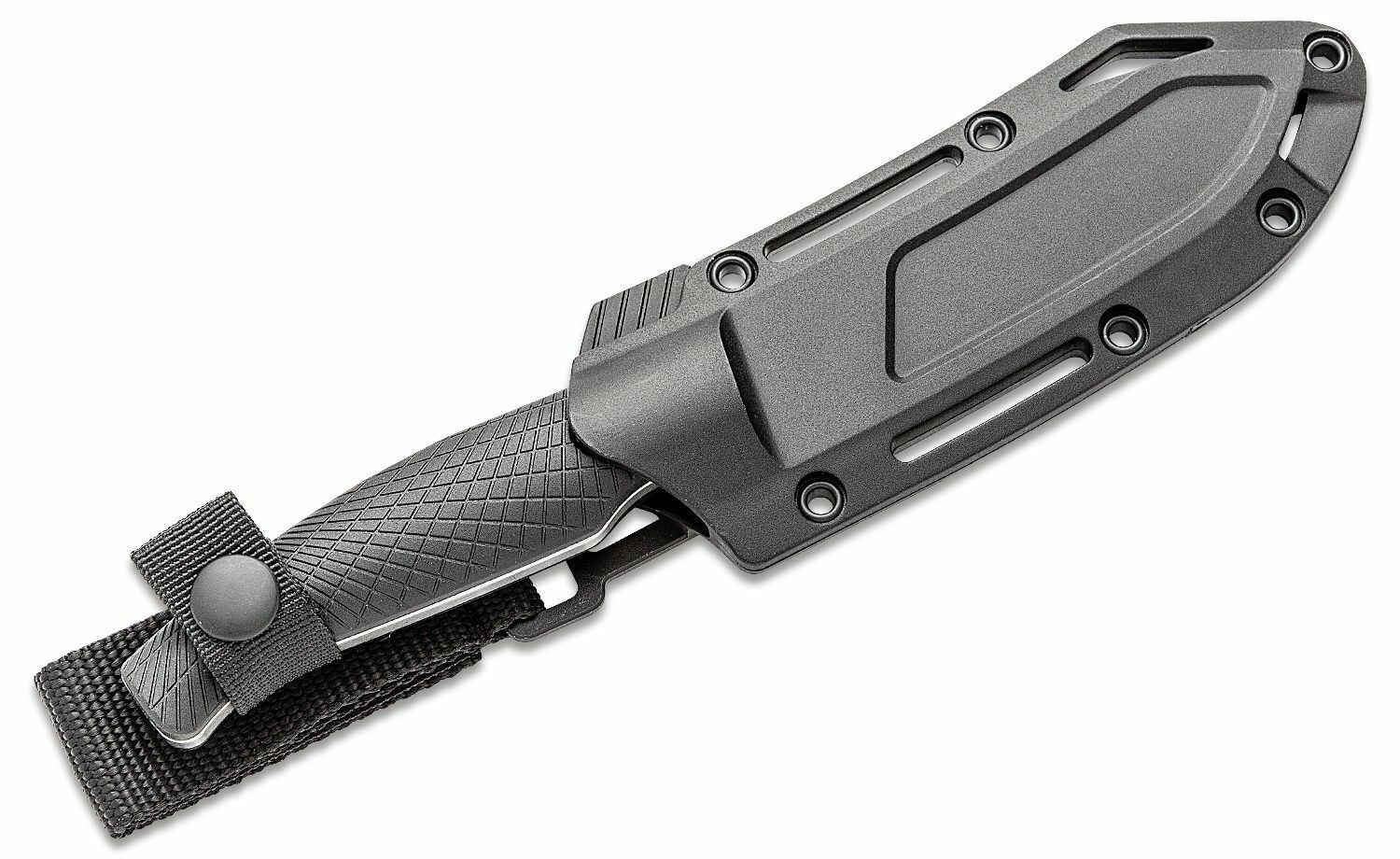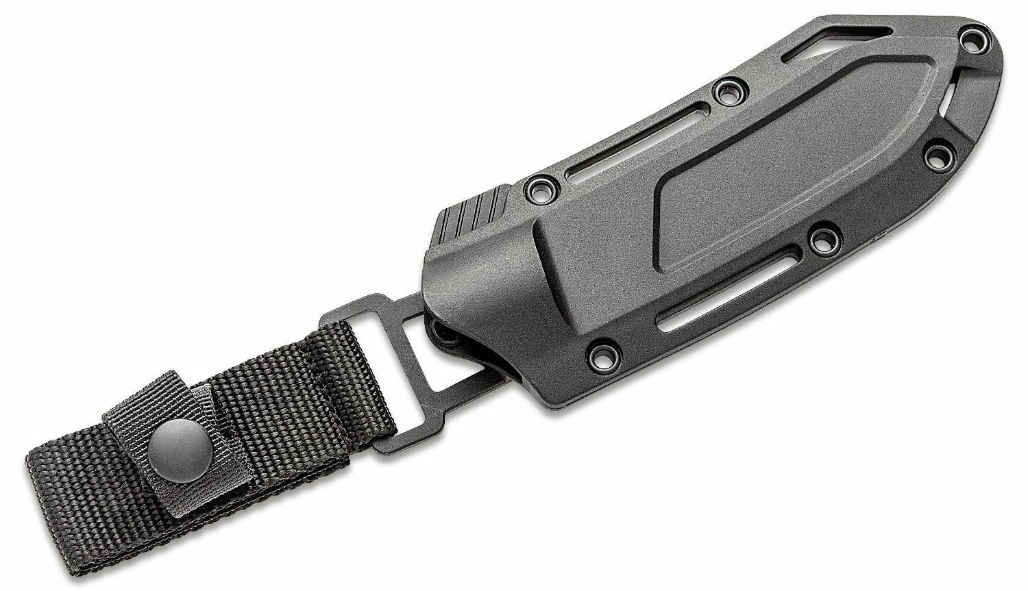 L’étui FRN moulé avec multiples points de fixation et sûreté en nylon maintient fermement le couteau en place lors du port, y compris en position pointe vers le haut.