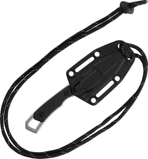 Le manche ergonomique en GFN noir (nylon renforcé de fibre de verre) assure une prise en main sûre et un excellent contrôle pendant l’utilisation. Sont inclus un étui plastique léger et une cordelette paracorde pour un port discret et sécurisé autour du cou.
