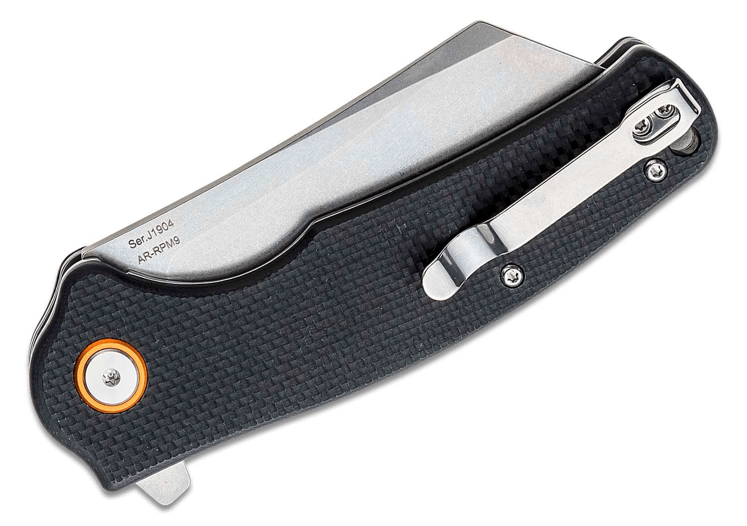 Solide couteau EDC CJRB Crag avec lame type cleaver en acier fritté AR-RPM9 et finition stonewash, prêt pour les tâches les plus exigeantes. Ouverture rapide par flipper, sécurité assurée par le liner lock et prise en main ferme grâce aux plaquettes G10 noires. Clip de poche pratique et œillet pour cordon pour un port quotidien confortable.