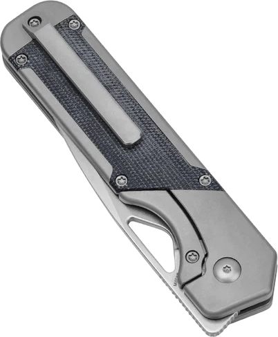 L’ouverture est rapide et sûre – on peut utiliser le trou de pouce ou le front flipper. Le verrou robuste Framelock garantit la sécurité au travail. La poignée ergonomique associe titane et micarta composite pour une faible masse, une prise en main agréable et une longue durée de vie. Le clip de poche titane 3D pratique permet un port discret côté droit.