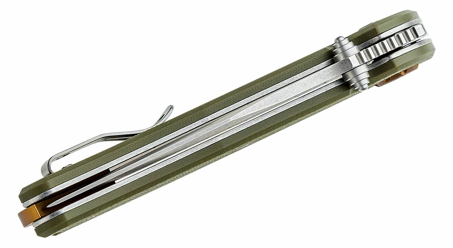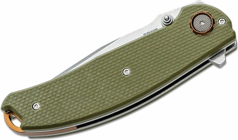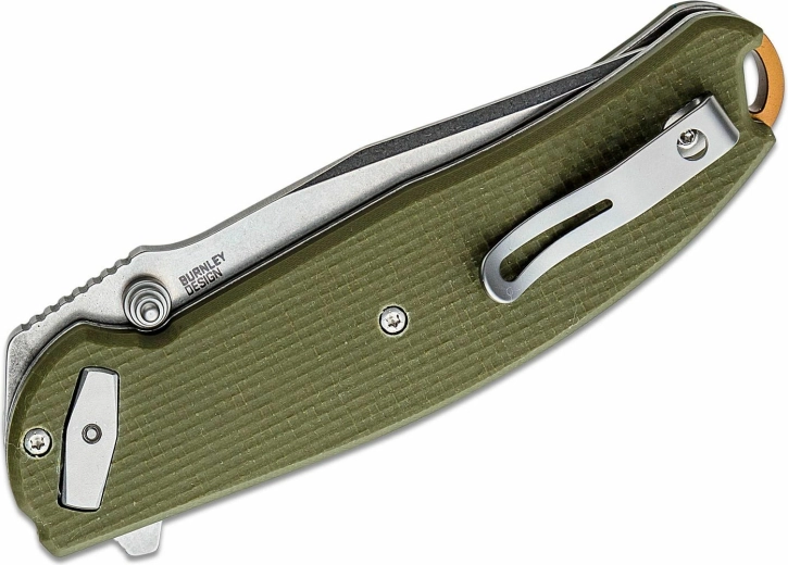 En position ouverte, la lame est solidement verrouillée par le verrou Dead Bolt, ce qui augmente la robustesse et la confiance au travail. Les plaquettes en G10 ergonomiques de couleur verte offrent une excellente prise même dans des conditions difficiles, tandis que le clip de poche et l’œillet pour cordon facilitent un port confortable et discret.