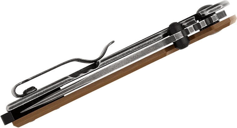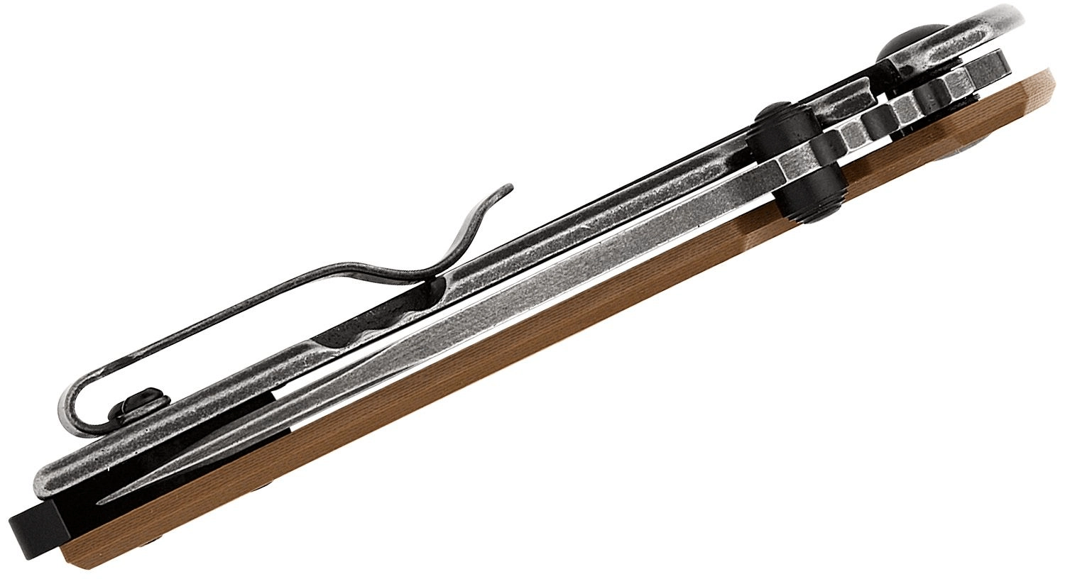 Grâce au double système d’ouverture – flipper et ergots de pouce – vous ouvrez le couteau rapidement et en sécurité dans toute situation. Le framelock maintient la lame solidement pendant le travail. La poignée combine le G10 marron adhérent avec un châssis en acier; on retrouve un clip de poche pour port profond et un œillet pour cordon pour plus de sécurité et de personnalisation.