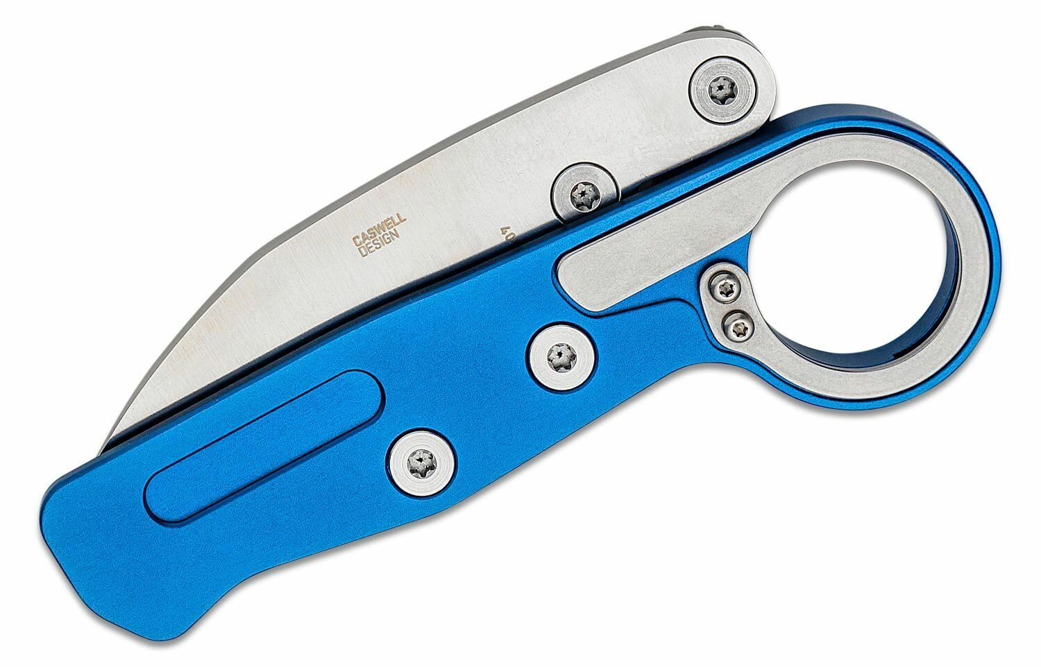 Poignée anodisée bleue avec anneau intégré et clip de poche assurant une prise ferme et un port confortable.