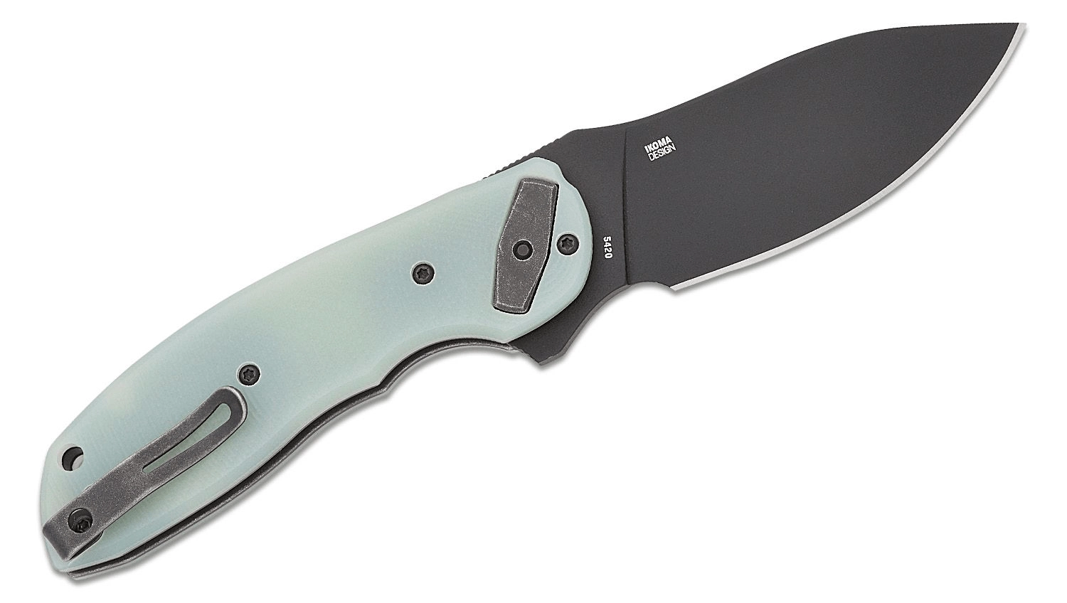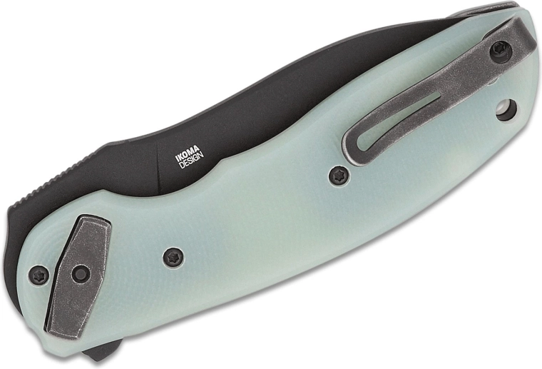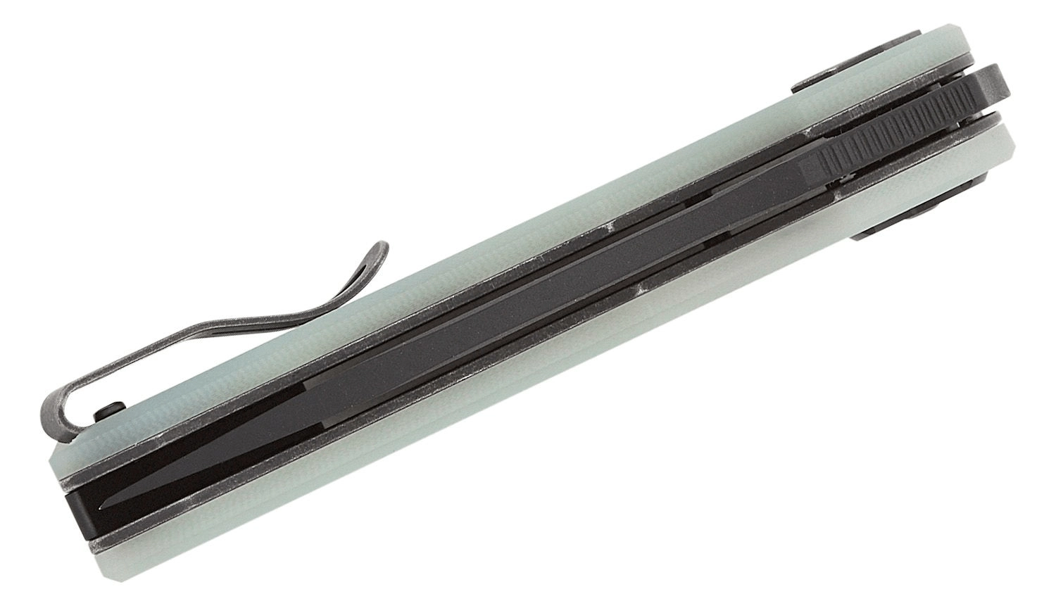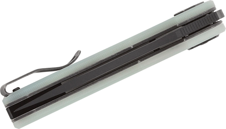 La poignée en G10 résistant, dans une teinte jade, garantit une prise sûre même dans des conditions plus exigeantes. Un clip de poche pratique pour un port discret au quotidien et un trou pour paracorde complètent l’équipement fonctionnel.