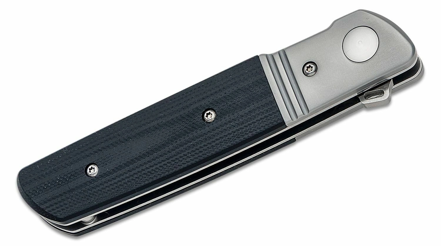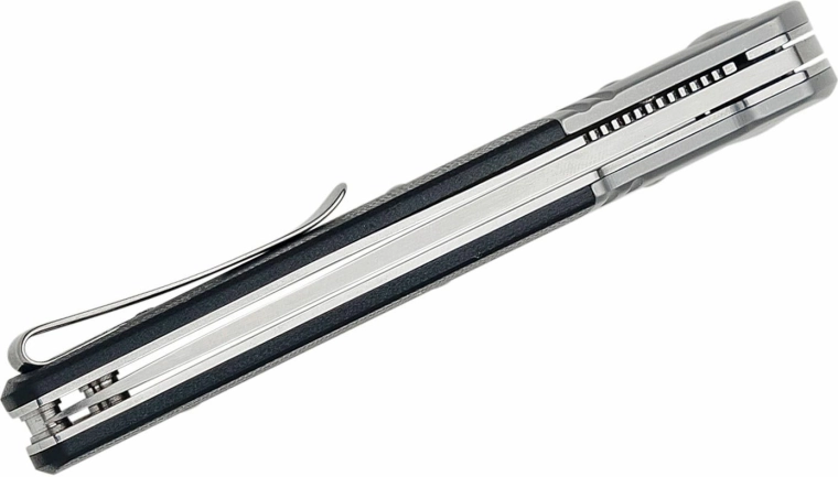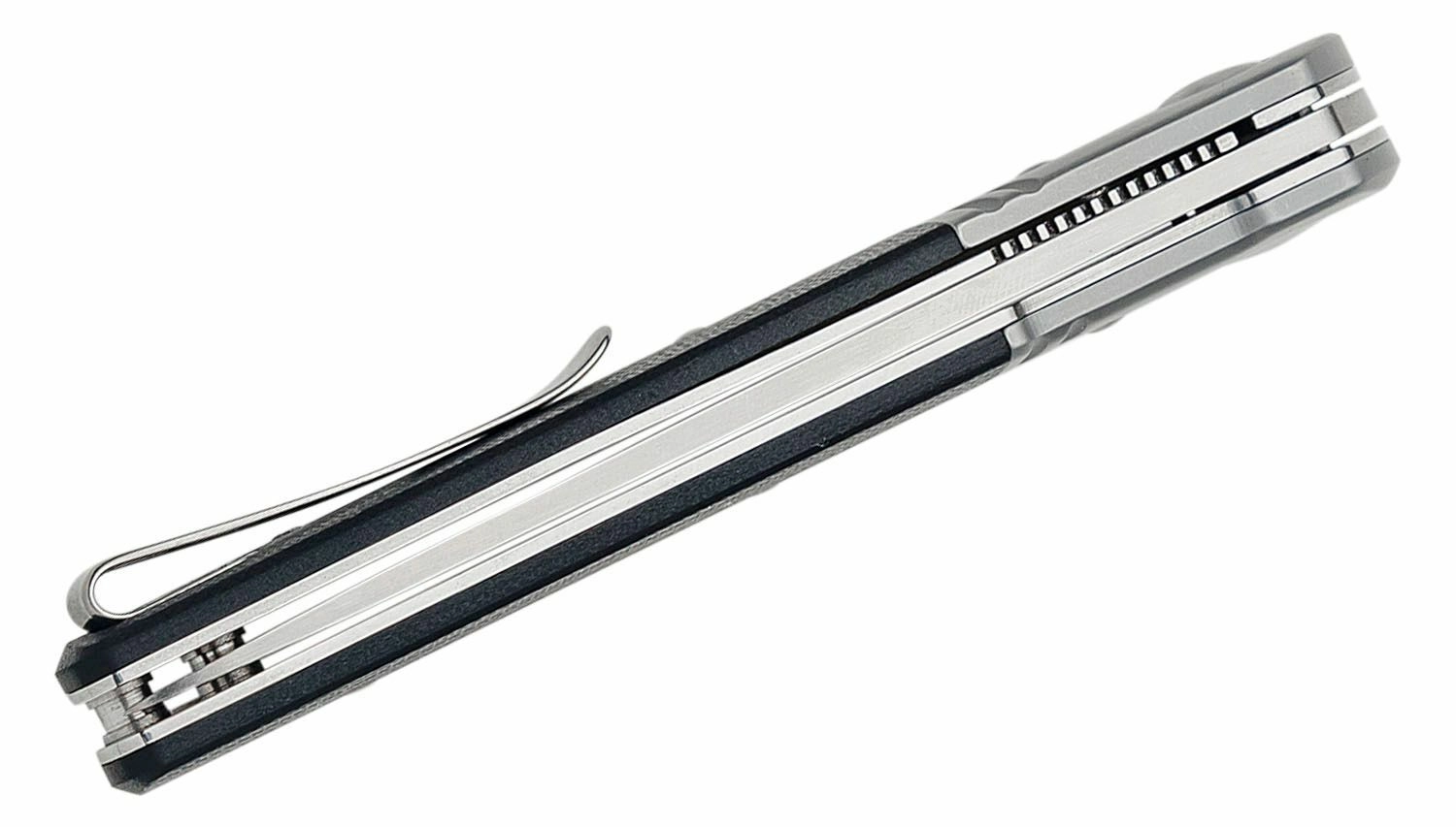 Les plaquettes en G10 noir offrent une prise ferme, tandis que le liner lock fixe la lame de manière fiable pendant le travail. Le clip profond facilite le port au quotidien.