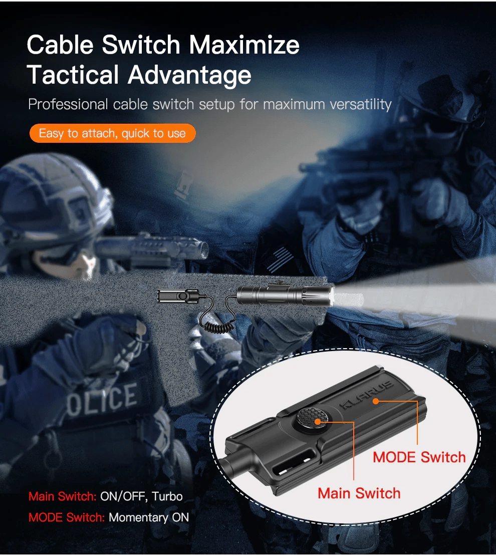 L’alimentation par un accu haute intensité 21700 5000 mAh (15 A) procure jusqu’à 375 heures d’utilisation et une recharge pratique via USB‑C. L’interface à attache rapide pour rail Picatinny assure une fixation sûre, même avec des gants et dans l’obscurité totale. Le coffret comprend un interrupteur filaire à distance avec un bouton principal rond (marche/arrêt, TURBO en éclairage constant) et un bouton allongé de sélection de mode (commande momentanée).