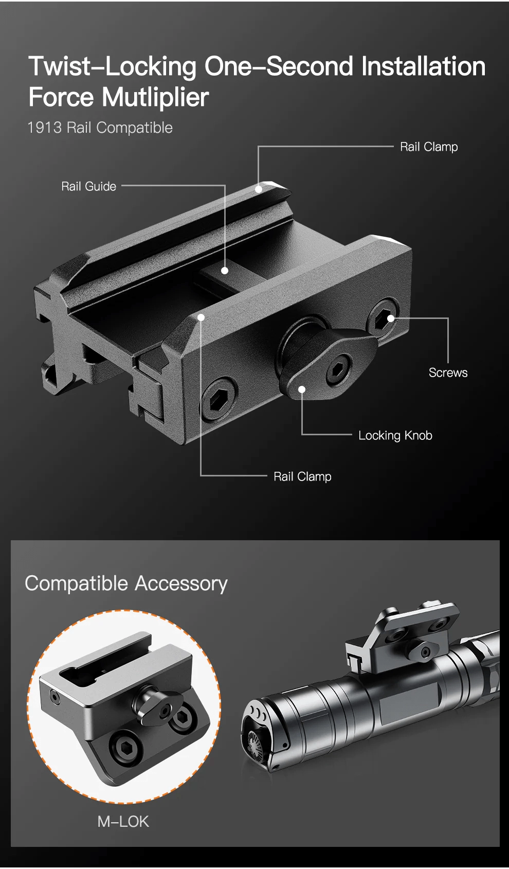 - Deux options de montage (avant ou arrière) sans changer la position de la pince de rail