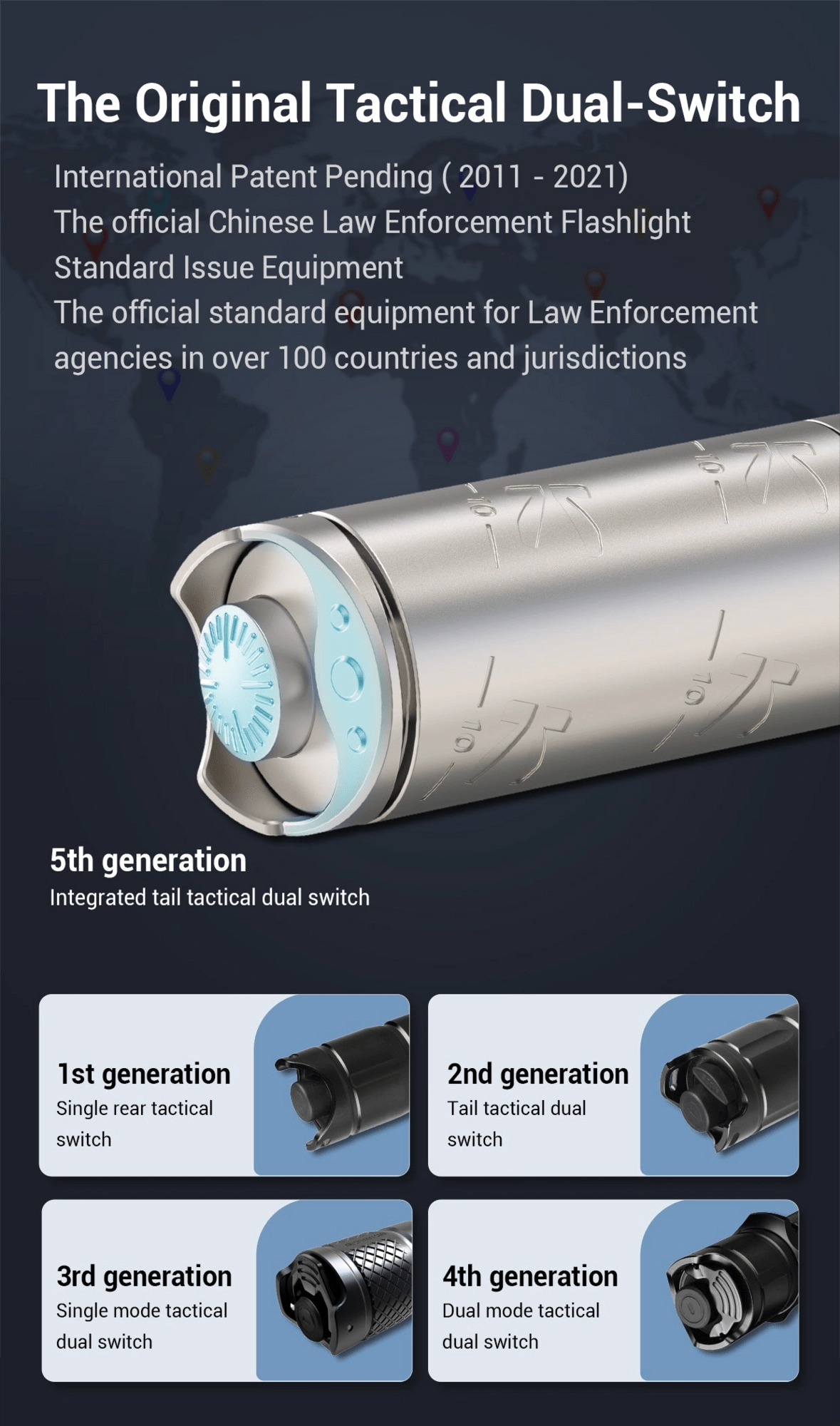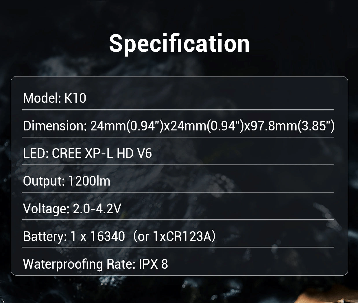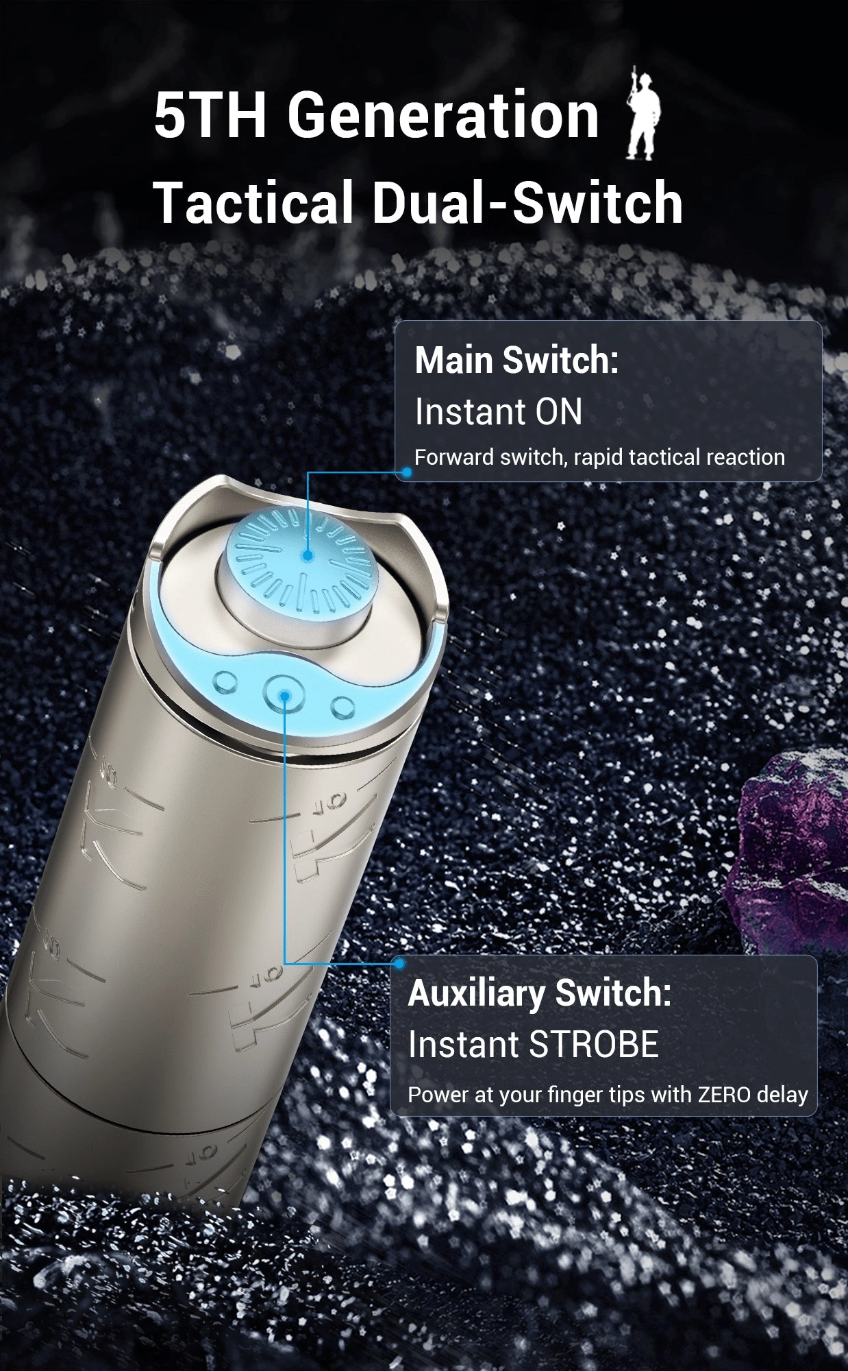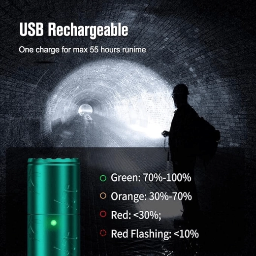 Le contrôle est assuré par un double interrupteur tactique en bout de lampe pour un accès rapide aux 4 modes, au stroboscope et au SOS. L’alimentation est fournie par un accumulateur 16340 Li‑ion avec recharge Micro USB (inclus), et il est également possible d’utiliser 1× CR123A. Le système de protection thermique maintient une température optimale pour le meilleur équilibre entre performance et sécurité, tandis que la norme IPX8 garantit une haute résistance à l’eau.