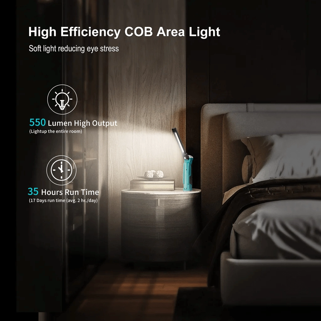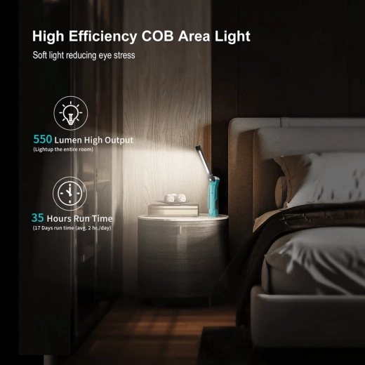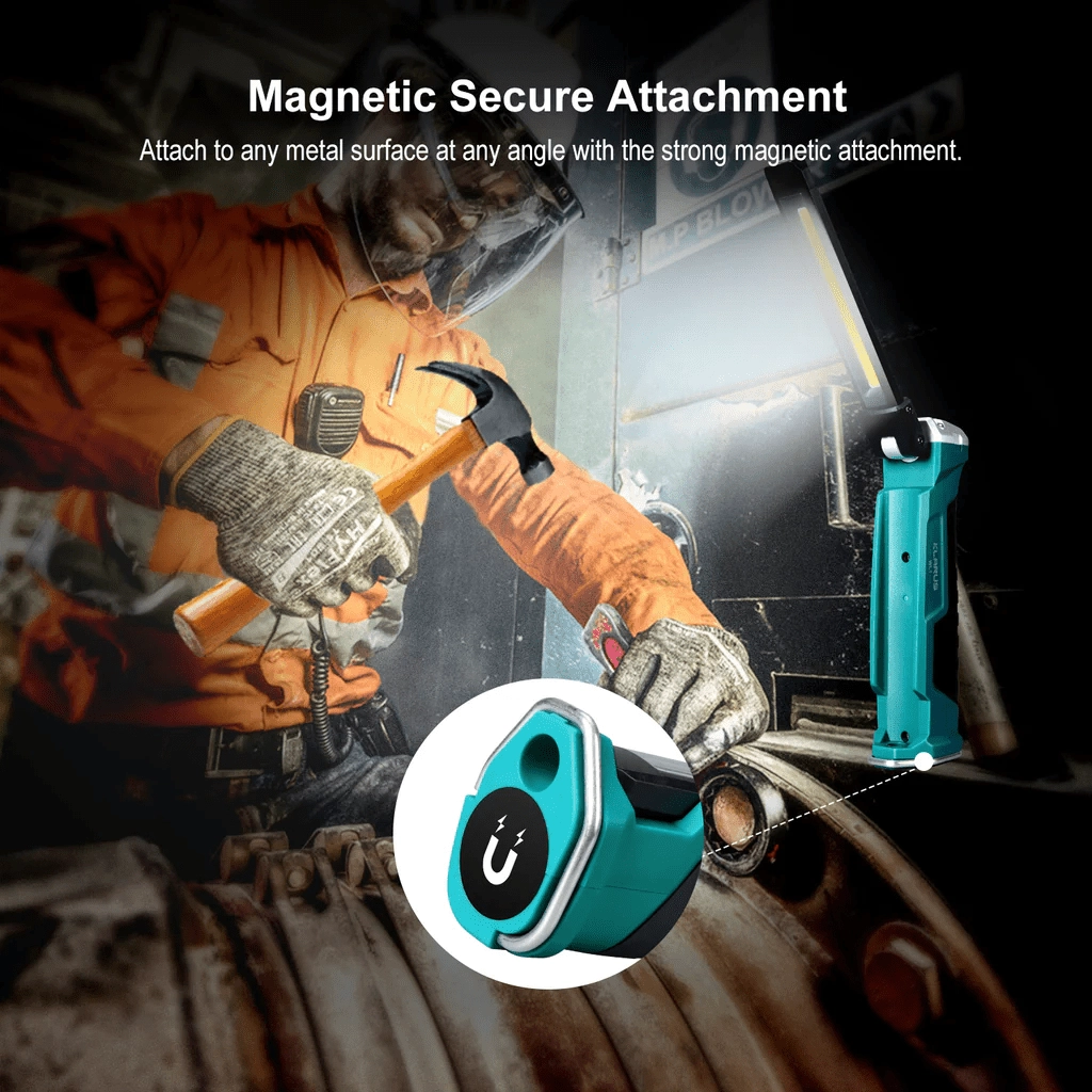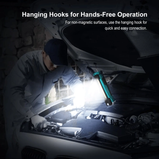 Le panneau COB fournit jusqu’à 550 lm avec une portée de 31 m, tandis que la LED frontale offre une lumière blanc jour de 80 lm avec une portée de 12 m. Au total, 7 modes sont disponibles, dont des modes blancs (faible/moyen/élevé) et des modes d’alerte rouges (clignotant, stroboscope), plus 2 modes du projecteur frontal. Un aimant puissant à la base et un crochet arrière permettent une fixation rapide sur les surfaces métalliques ou en suspension.