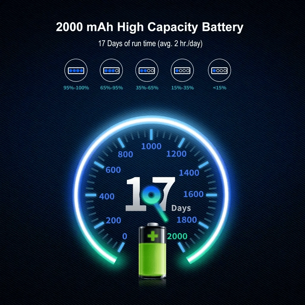 La batterie intégrée de 2000 mAh se recharge via micro‑USB (câble inclus). Un indicateur à 4 niveaux de l’état de charge vous informe en temps réel. L’autonomie atteint jusqu’à 35 heures en mode faible et environ 2,5 heures en haute luminosité après une charge complète.