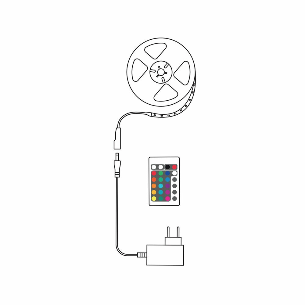 Contenu de l’emballage : 1× ruban LED 5 m, 1× adaptateur secteur avec fiche EU (150 cm), 1× télécommande (pile CR2025 incluse).