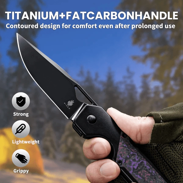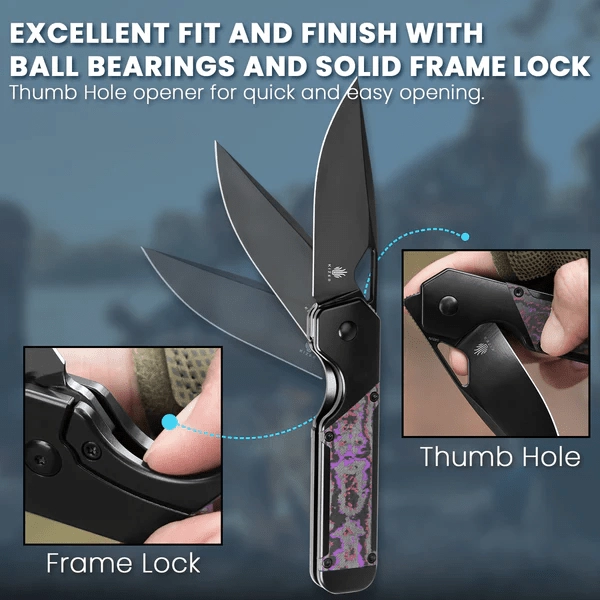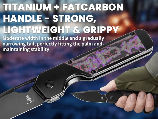 Élégant couteau EDC KIZER Militaw alliant forme drop point classique à un design moderne et des matériaux de pointe. Il offre acier CPM-S45VN avec revêtement DLC pour une longévité de coupe et une grande résistance, ouverture rapide par flipper et trou pour le pouce et sécurité d'un verrouillage framelock. Le manche en titane avec Fatcarbon Purple Haze et clip de port profond fait de ce couteau un choix idéal pour l’usage quotidien, l’atelier et l’outdoor.