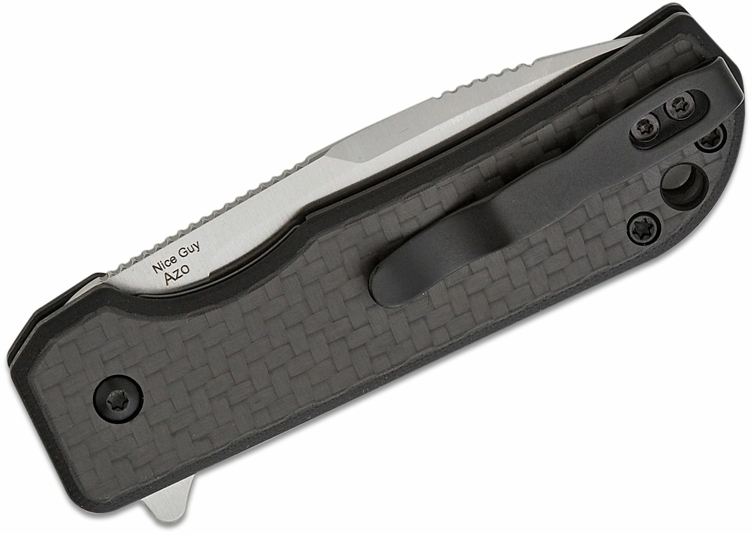 Couteau EDC compact Kizer Nice Guy conçu par le designer Azo, doté d'une lame 154CM fiable avec finition satinée, ouverture rapide par flipper et verrouillage Linerlock sécurisé. La poignée en fibre de carbone légère assure une prise en main sûre, avec clip de poche et trou pour cordon intégrés.