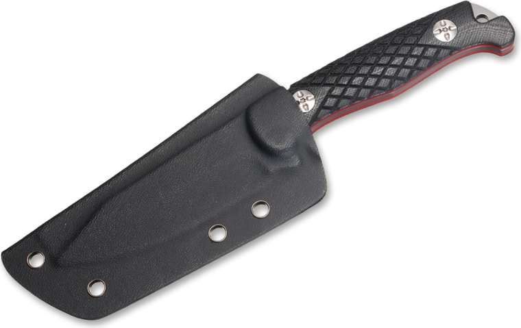 La poignée en G10 avec texture antidérapante inspirée de la peau de poisson assure une prise en main sûre même mouillée. Les couches rouges décoratives apportent une allure attrayante. Le étui Kydex avec adaptateur de ceinture permet un port confortable et sécurisé, tant en extérieur qu’en milieu urbain.