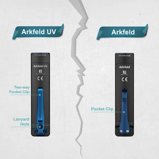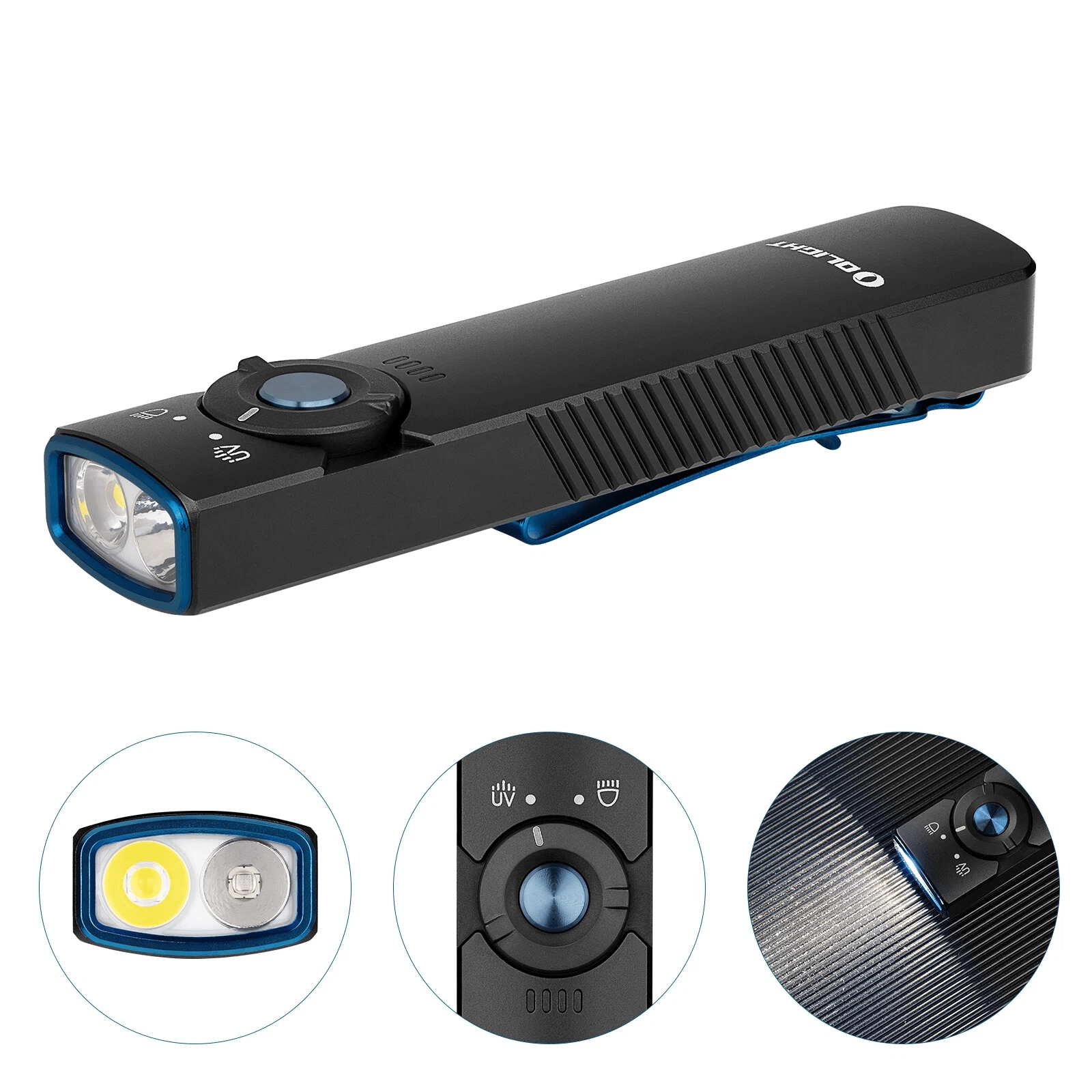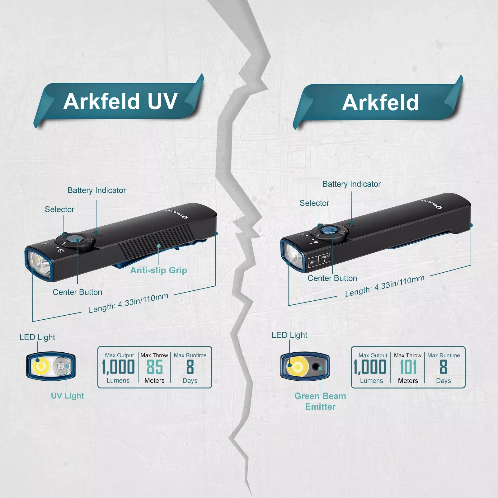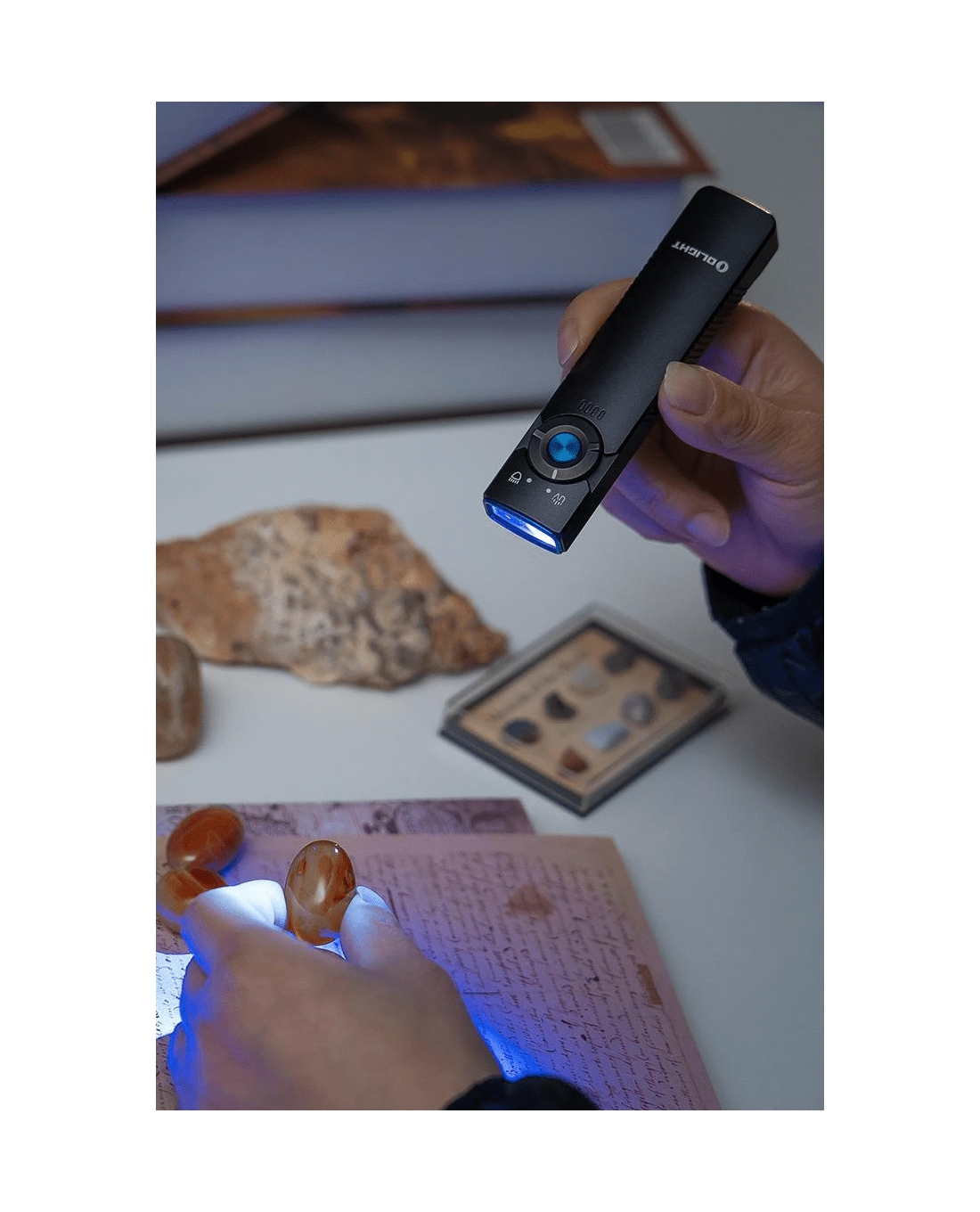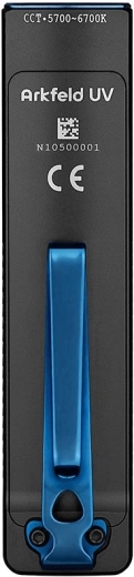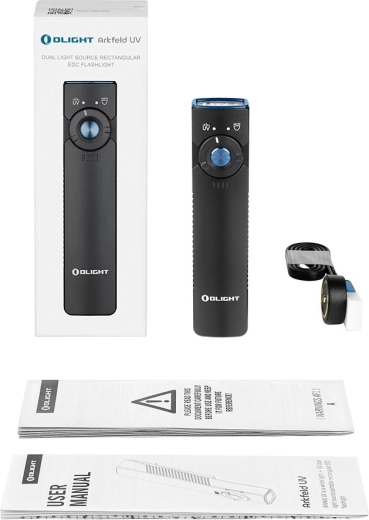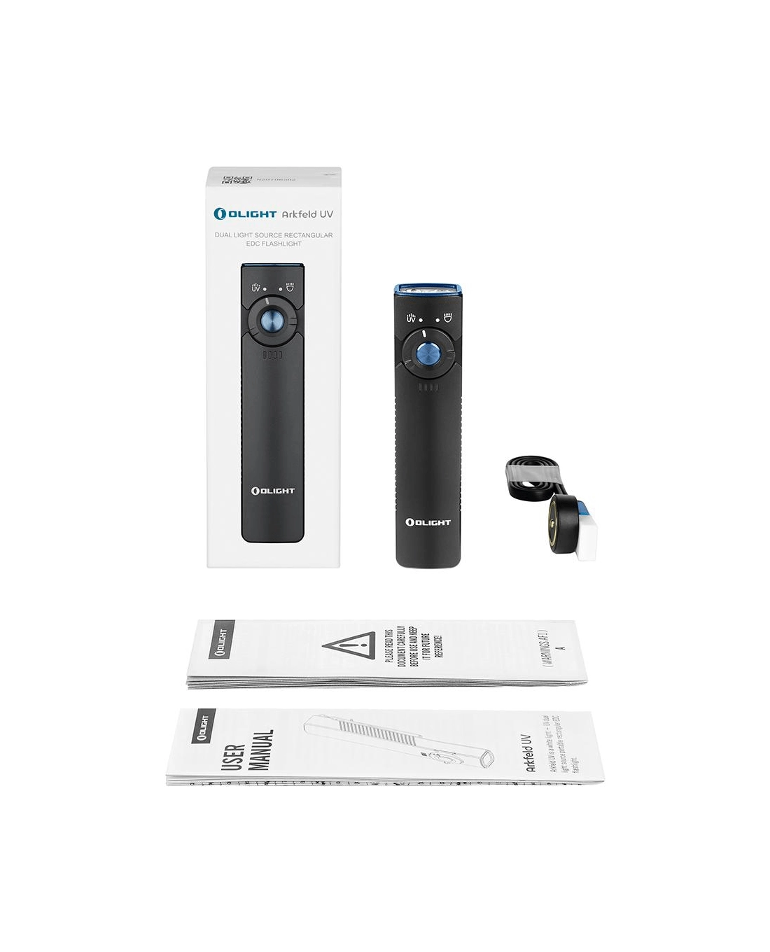 L’OLIGHT Arkfeld UV est une lampe EDC de poche au design plat unique qui combine une LED blanche neutre (4000–5000 K) pour l’éclairage quotidien et une diode UV 365 nm (580 mW) pour le contrôle des billets, la détection de minéraux fluorescents ou l’hygiène des surfaces. La portée maximale de la lumière blanche est de 85 m et la puissance de crête atteint 1 000 lm.