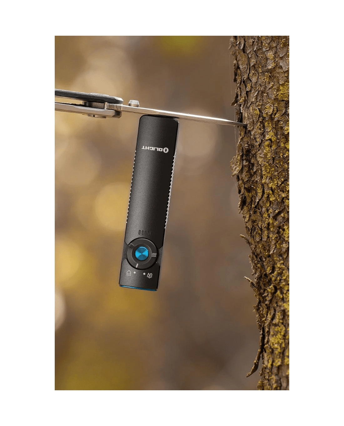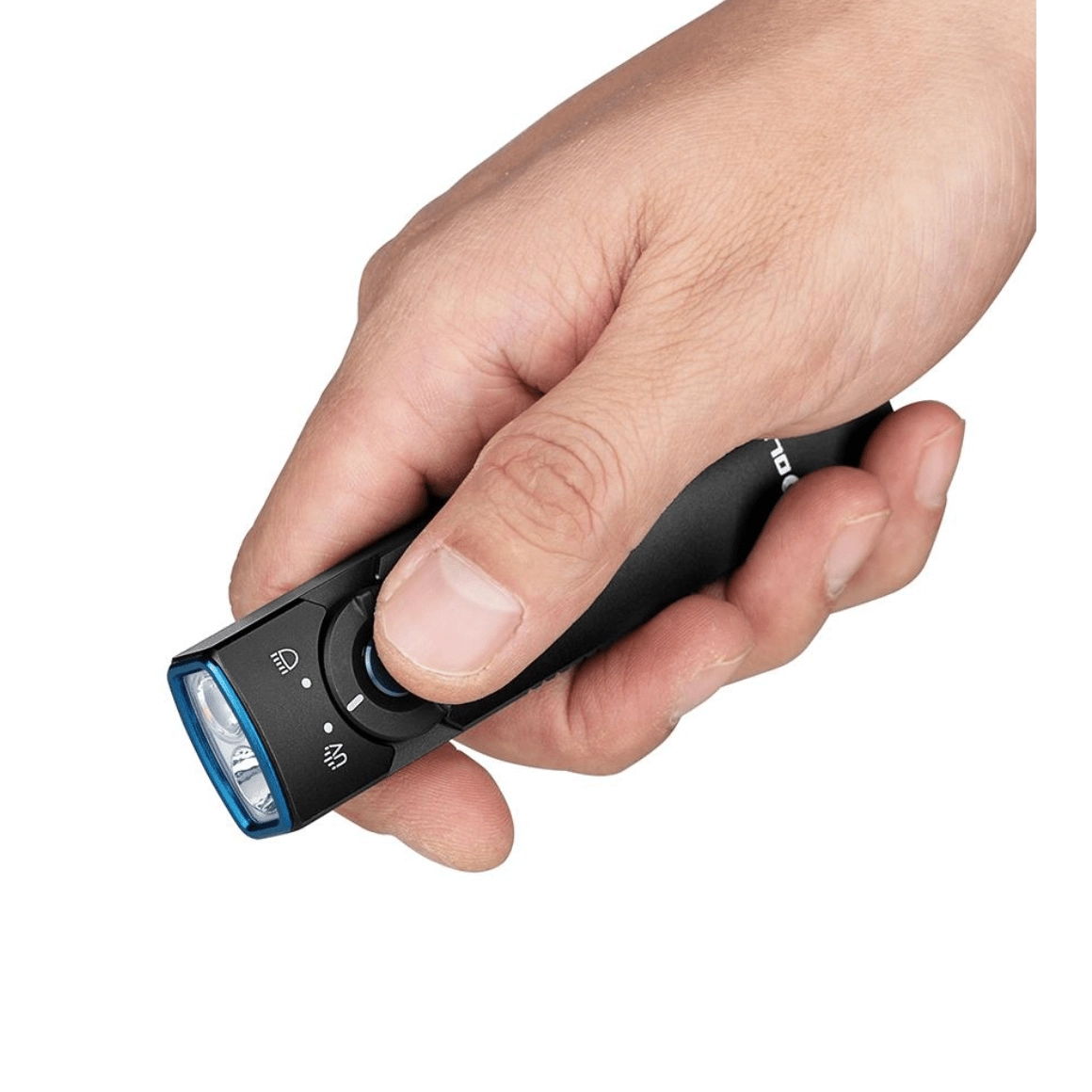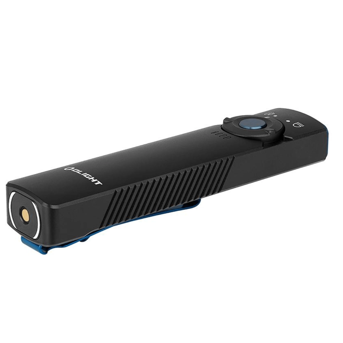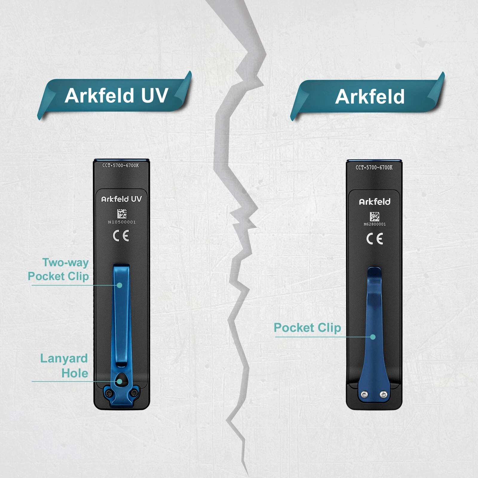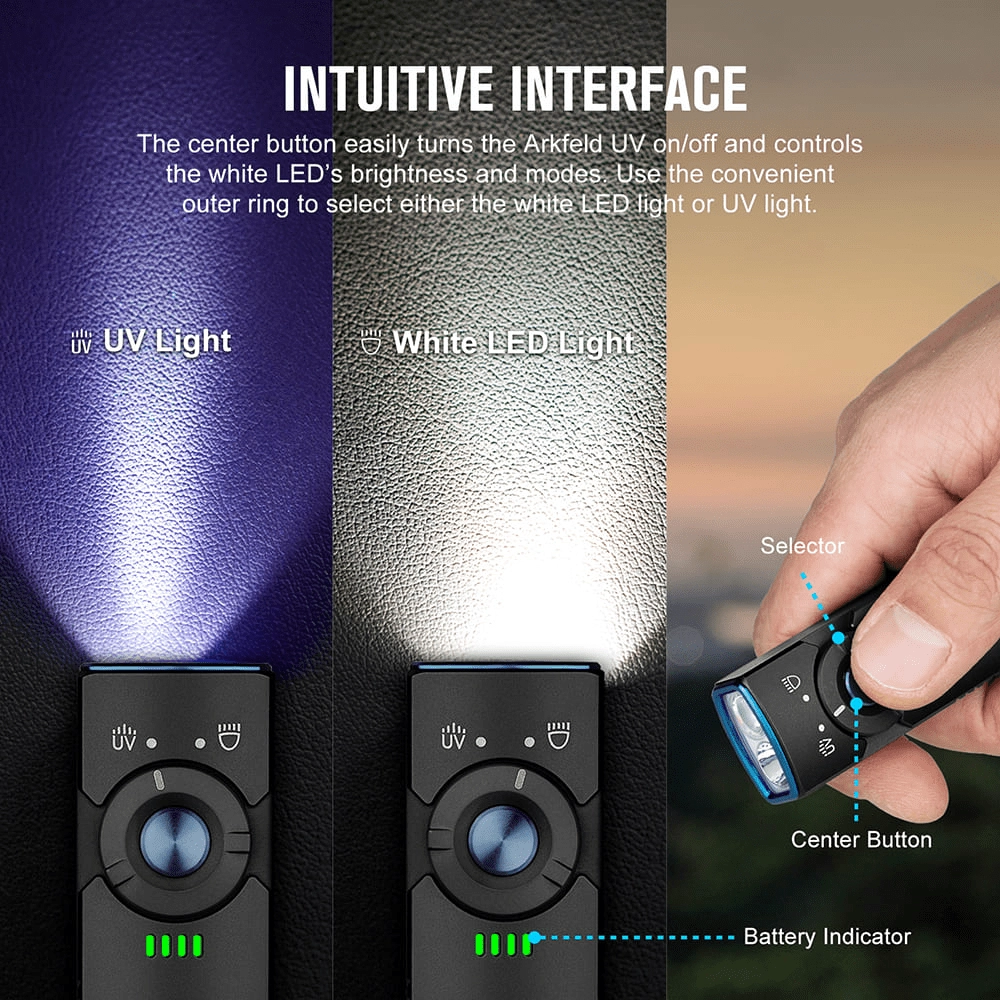 L’OLIGHT Arkfeld UV est une lampe EDC de poche au design plat unique qui combine une LED blanche neutre (4000–5000 K) pour l’éclairage quotidien et une diode UV 365 nm (580 mW) pour le contrôle des billets, la détection de minéraux fluorescents ou l’hygiène des surfaces. La portée maximale de la lumière blanche est de 85 m et la puissance de crête atteint 1 000 lm.