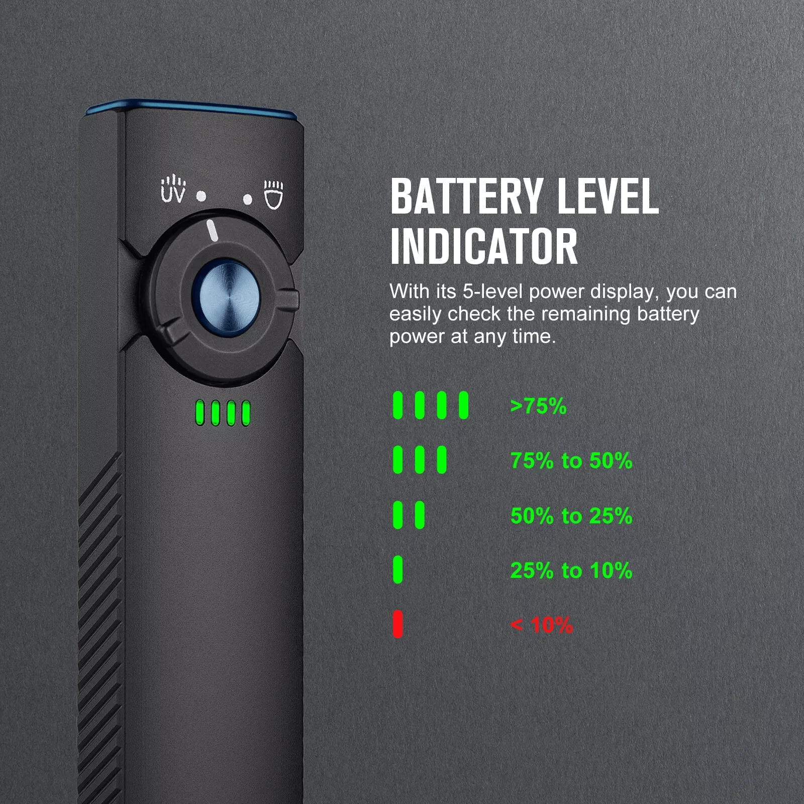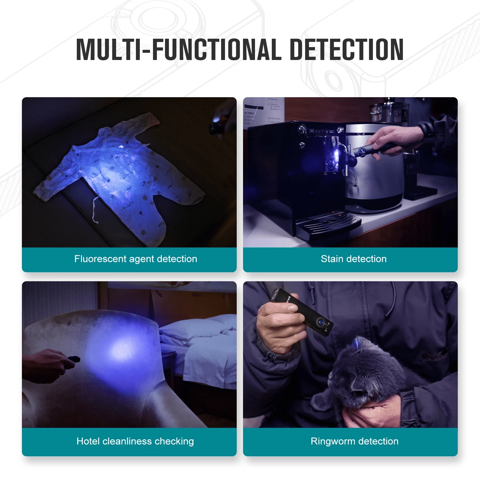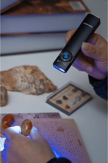 Basculez entre une lumière blanche neutre offrant jusqu’à 1 000 lm pour l’éclairage quotidien et une puissante lumière UV 365 nm (580 mW) pour la vérification des billets, la détection d’impuretés ou de minéraux.