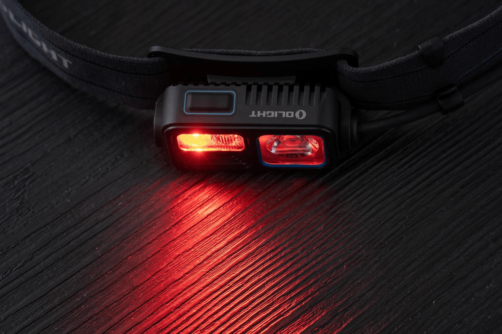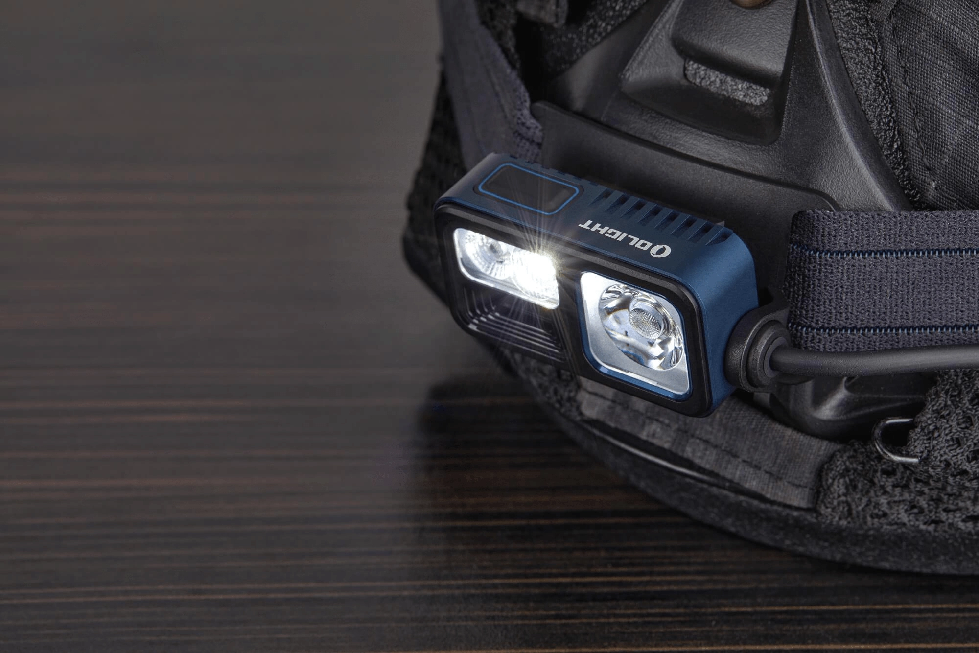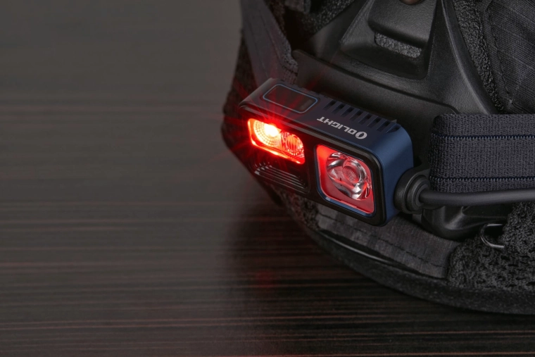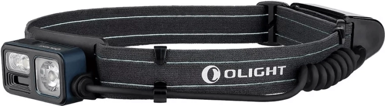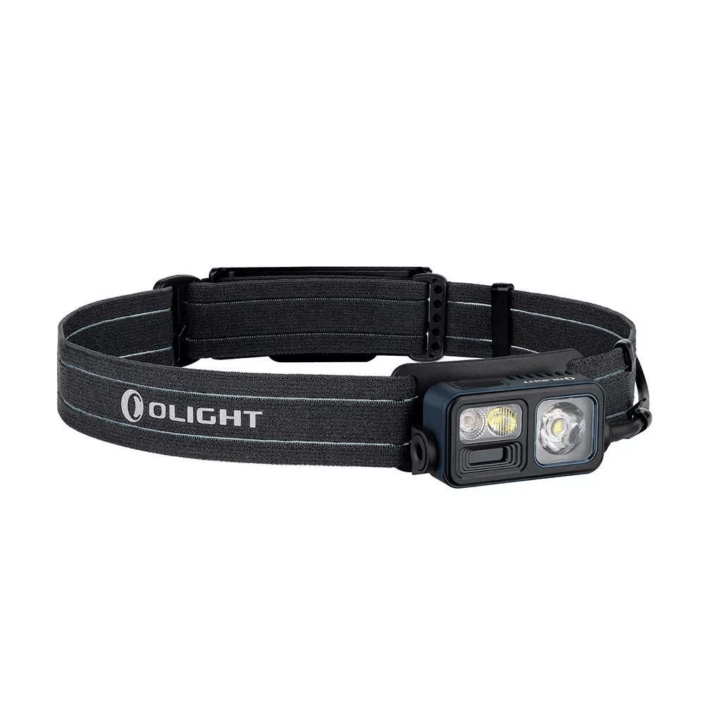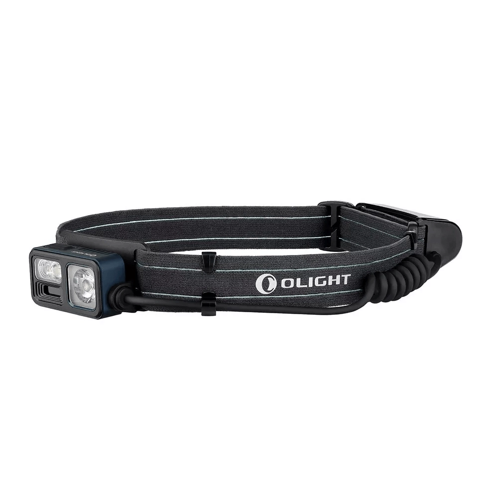 Lampe frontale polyvalente OLIGHT Array 2S Midnight Blue Limited Edition pour la course, le camping, l’escalade et le travail, offrant jusqu’à 1000 lm, une portée de 140 m, un contrôle gestuel sans contact et une autonomie allant jusqu’à 30 heures grâce à la batterie rechargeable 2600 mAh (USB‑C). Elle combine faisceau ponctuel et diffus, dispose d’une lumière rouge et d’un mode SOS ainsi que d’un indicateur de sécurité arrière sur le pack batterie.