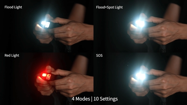 - 4 modes d’éclairage : flood (diffus), flood + spot (diffus + ponctuel), lumière rouge, SOS