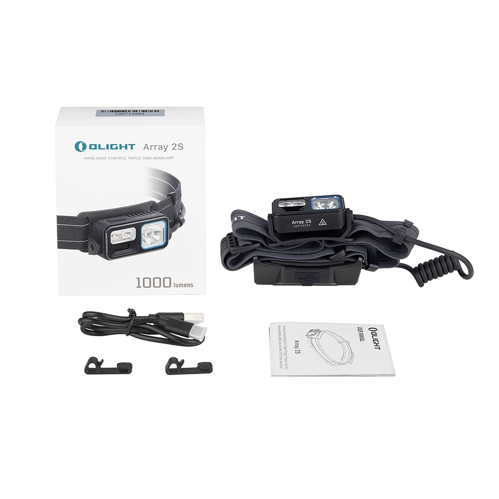- Lampe frontale Array 2S (serre‑tête et pack batterie), câble USB‑C, manuel d’utilisation