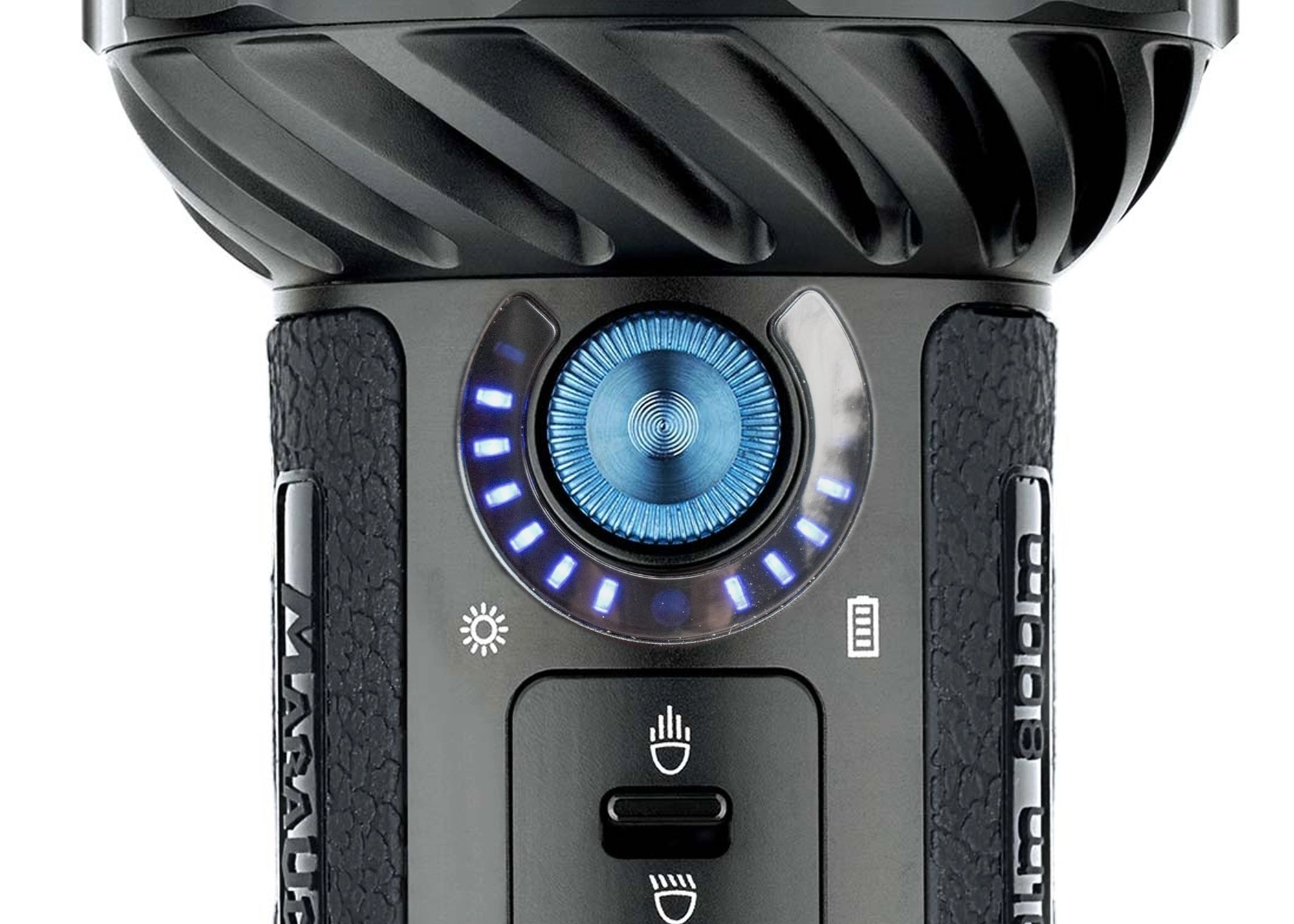 Vous cherchez une lampe pour des conditions exigeantes, des missions de recherche ou l’aventure en plein air ? L’Olight Marauder 2 allie une puissance lumineuse extrême jusqu’à 14 000 lm à une portée de faisceau de 800 m. D’un simple contrôleur, vous basculez aisément entre un large éclairage inondant et un faisceau étroit longue distance; 7 niveaux de luminosité et un stroboscope sont disponibles. Des indicateurs LED clairs informent sur la puissance choisie et l’état de la batterie.