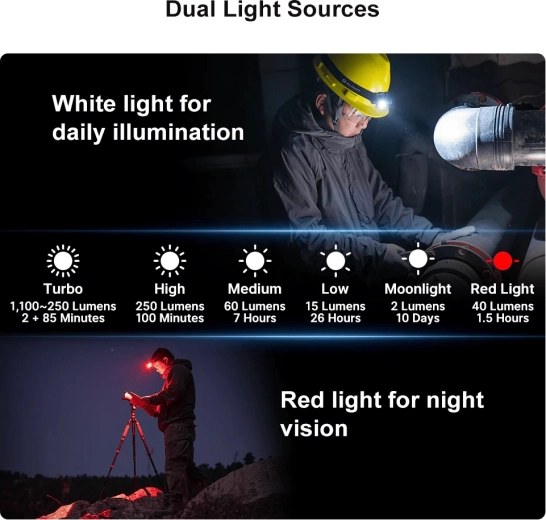 LED blanche puissante pour le travail et l’outdoor, LED rouge pour préserver la vision nocturne et pour la signalisation d’urgence. Un choix flexible pour chaque situation.
