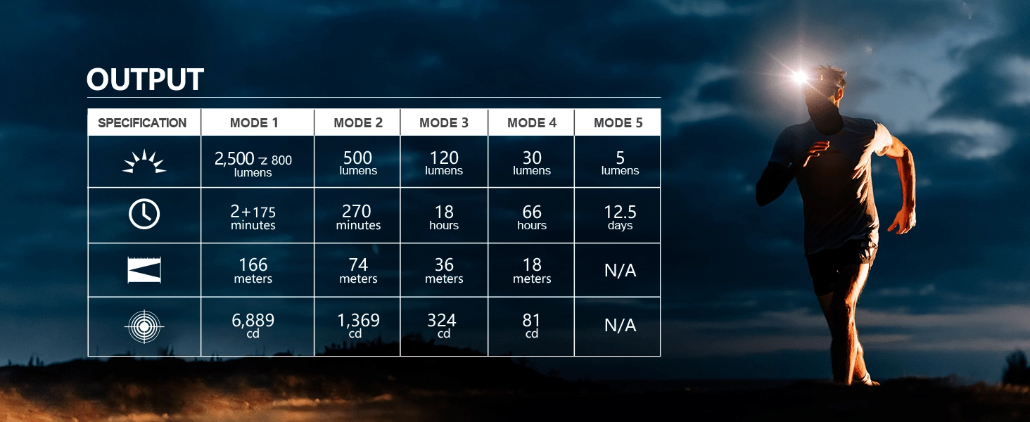 - Turbo 2500 → 800 lm / 2,5 min + 175 min ; Élevé 500 lm / 270 min ; Moyen 120 lm / 18 h ; Bas 30 lm / 66 h ; Moonlight 5 lm / 12,5 jours ; SOS/Balise