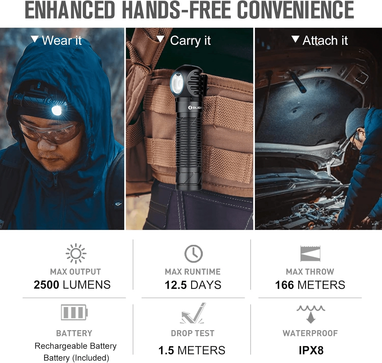 - Polyvalence maximale : clip de poche, bandeau et base magnétique pour diverses options de fixation.