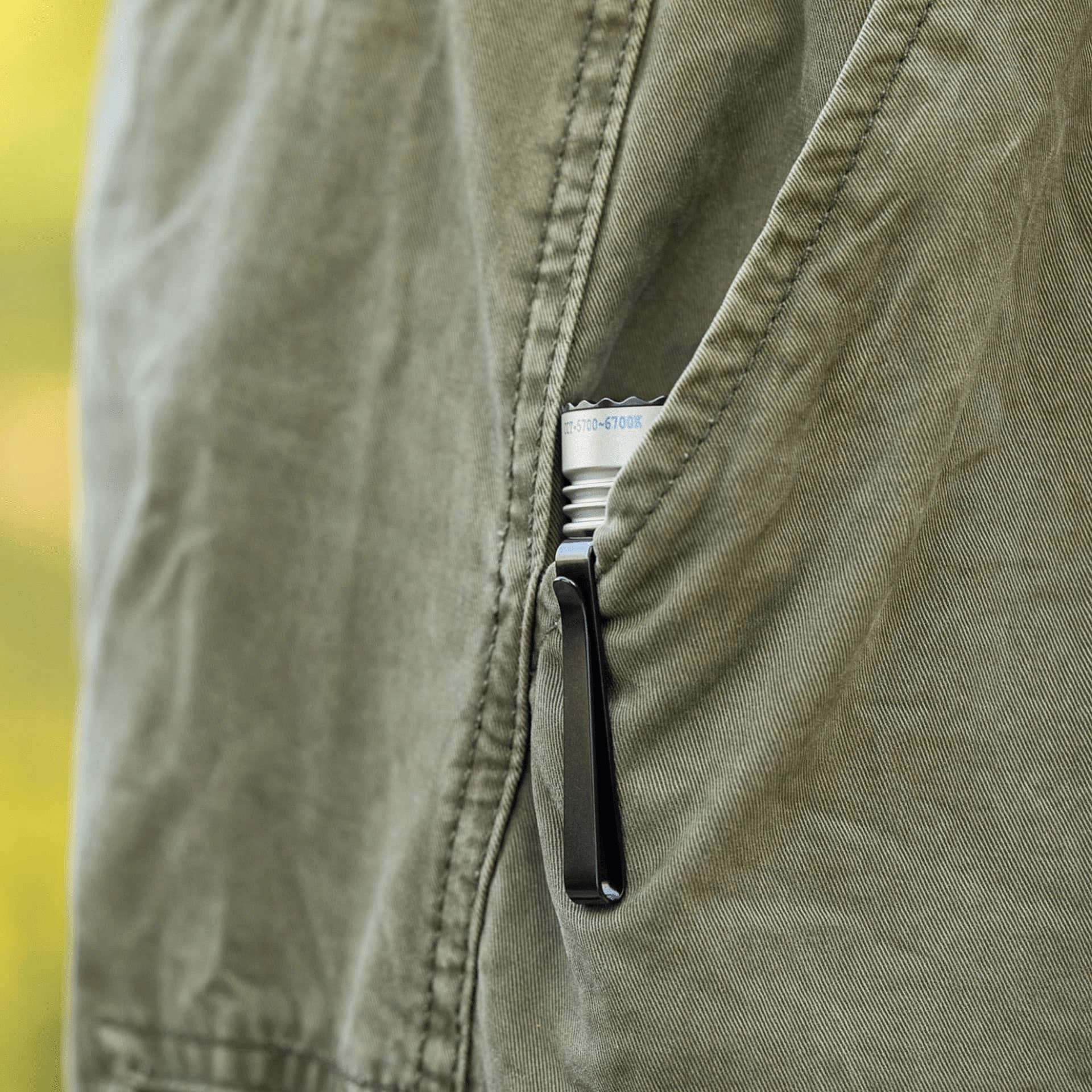 Corps compact en titane, clip bidirectionnel et interrupteur latéral avec indication d’état assurent une maîtrise sûre et un port quotidien aisé.