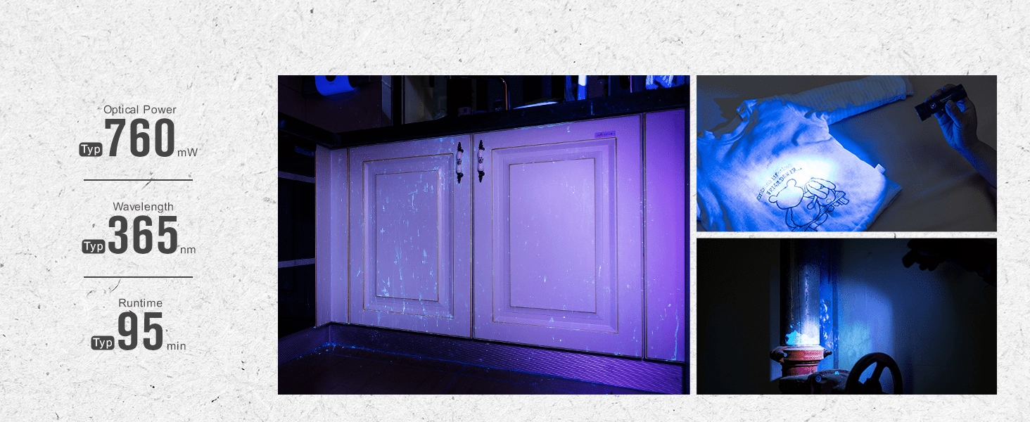 - UV 365 nm (760 mW) pour inspection, nettoyage et usage outdoor