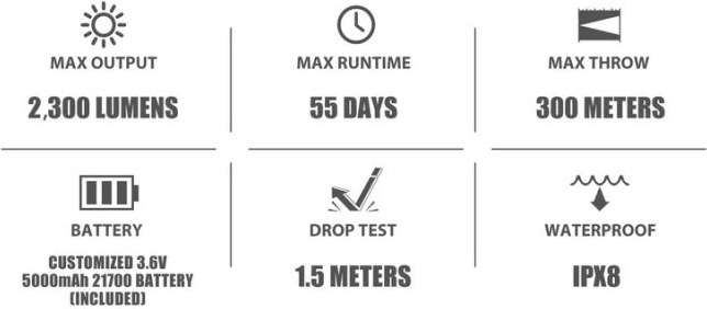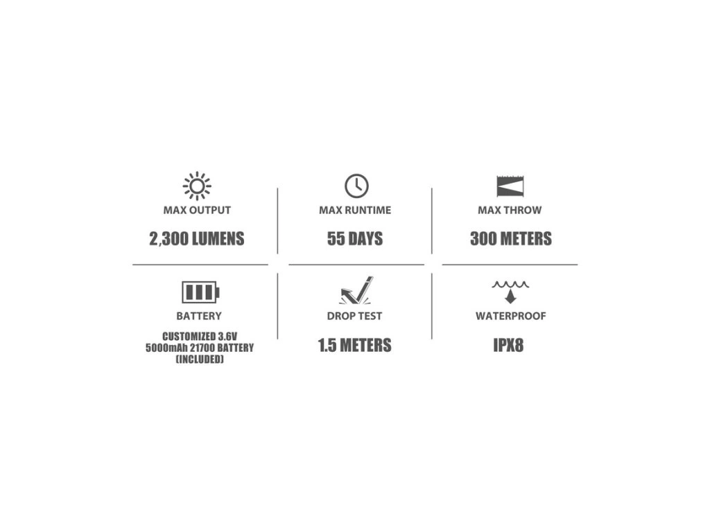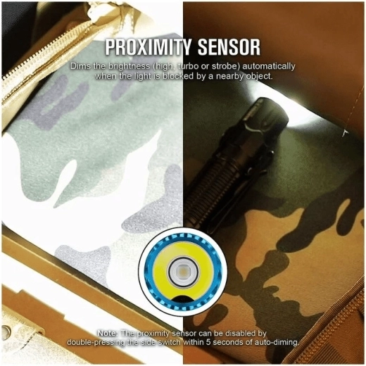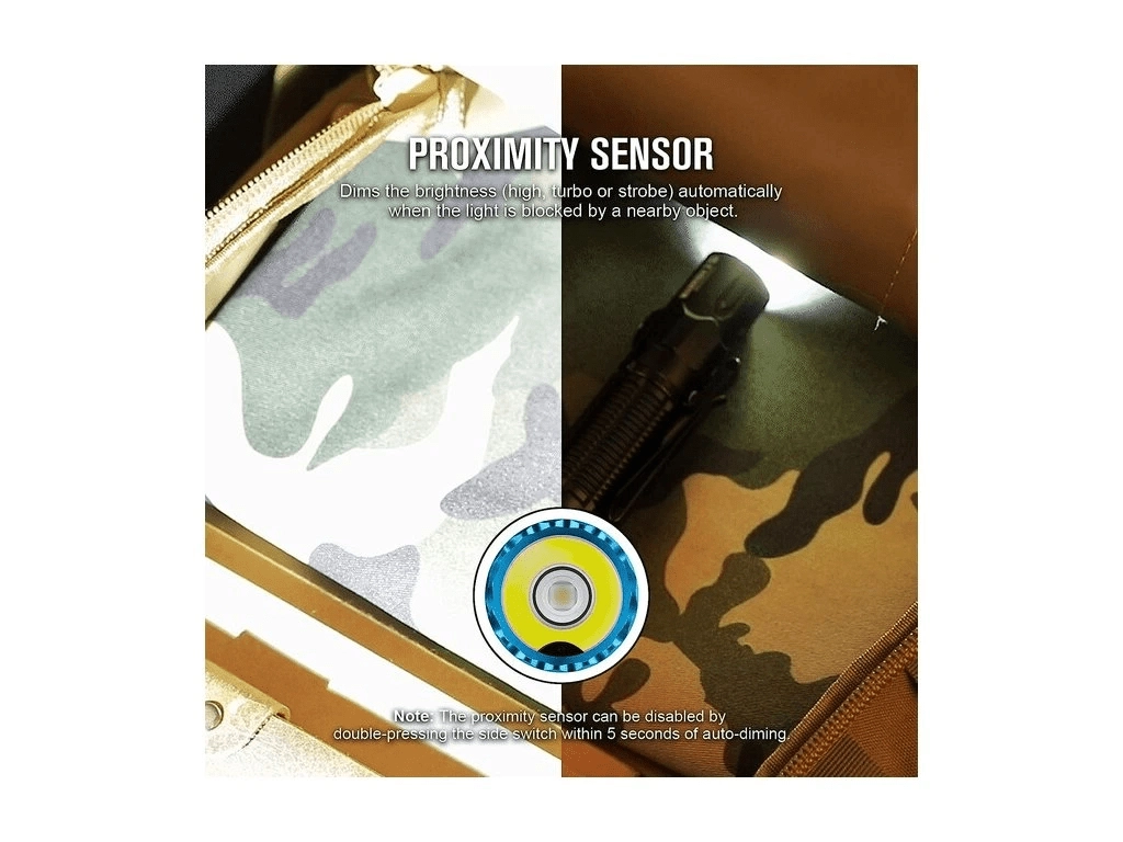 Le capteur de proximité intégré réduit automatiquement la luminosité en mode turbo pour plus de sécurité et pour éviter l’éblouissement ou la surchauffe. Alimentée par une batterie performante 21700 5000 mAh, elle offre une grande autonomie, tandis que la recharge pratique est assurée par le câble USB magnétique MCC3 inclus. Le corps robuste en alliage d’aluminium aéronautique offre une étanchéité IPX8, une résistance aux chutes de 1,5 m et une prise en main sûre grâce à sa texture.