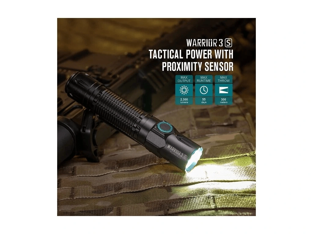 OLIGHT Warrior 3S est une lampe tactique EDC performante avec clip de poche, offrant jusqu’à 2300 lumens, une portée de 300 mètres et un double contrôle par interrupteur latéral et interrupteur arrière. Elle dispose d’un capteur de proximité pour réduire la luminosité en toute sécurité, d’une recharge rapide via câble USB magnétique MCC3 et d’un indicateur de batterie à 4 niveaux clair. Sa construction robuste en alliage d’aluminium répond à la norme IPX8 et résiste aux chutes de 1,5 m.