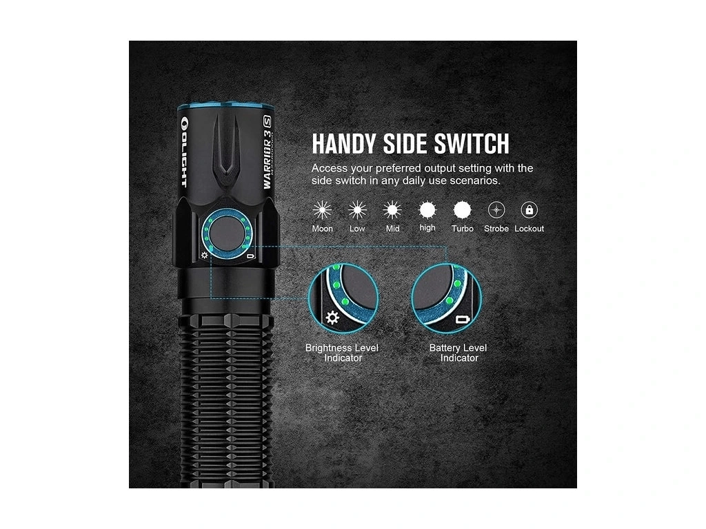 La Warrior 3S en finition élégante Dream Blue figure parmi les meilleures lampes tactiques de poche. La LED blanc froid associée à l’optique TIR fournit un faisceau concentré et lointain, avec une puissance jusqu’à 2300 lm et une portée de 300 m. Grâce au double contrôle, vous accédez rapidement au mode turbo/stroboscope via l’interrupteur arrière et sélectionnez confortablement jusqu’à 6 modes avec le bouton latéral.