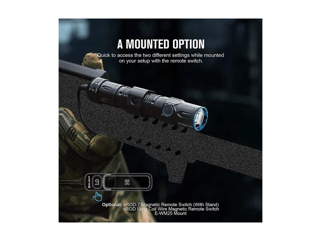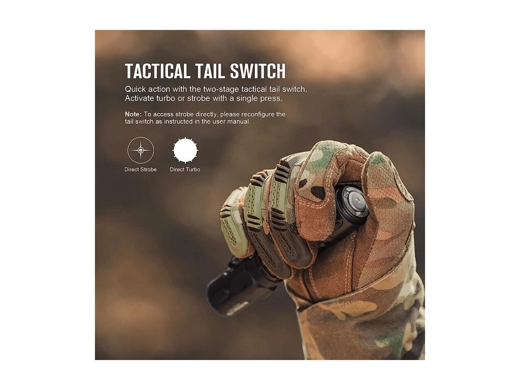 - Commande tactique rapide : interrupteur arrière silencieux pour 100 % instantané ou stroboscope, interrupteur latéral avec verrouillage contre l’allumage involontaire.