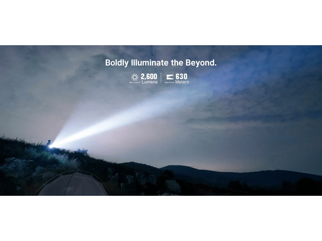 Une puissance maximale de 2600 lumens et une portée jusqu’à 630 mètres assurent une visibilité fiable même en terrain exigeant et dans l’obscurité totale.