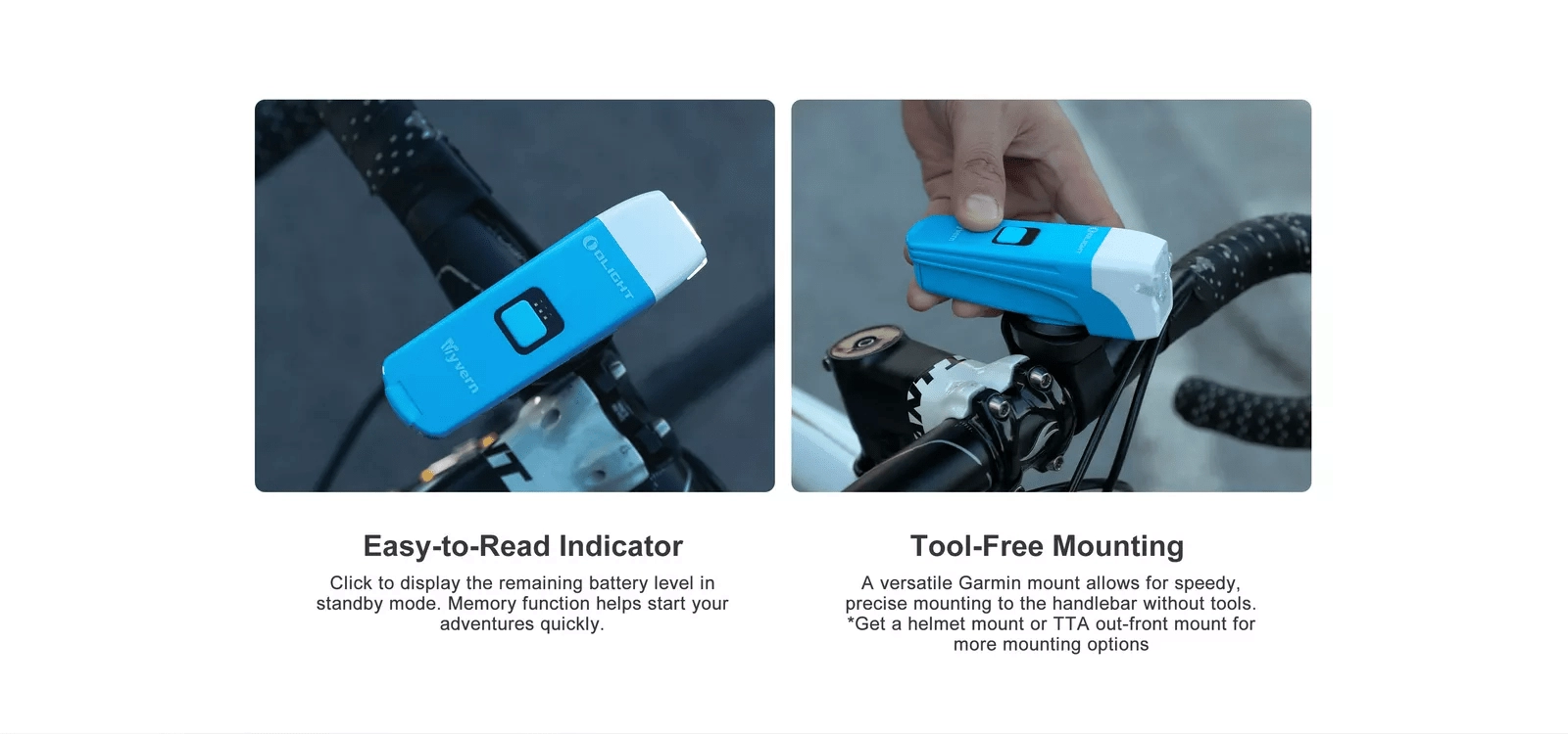 L’interface universelle Garmin™ permet une mise en place et un retrait instantanés du guidon. Sa conception compacte convient aussi parfaitement comme lampe de casque.